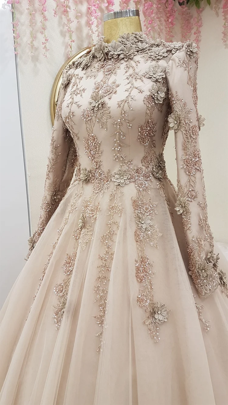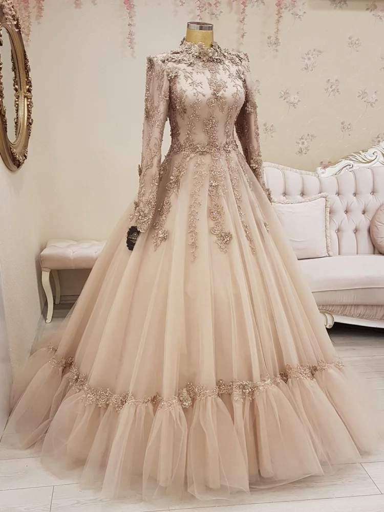Женское платье для выпускного Funyue, элегантное кружевное платье цвета шампанского с аппликацией, длинным рукавом, трапециевидного силуэта, 2022