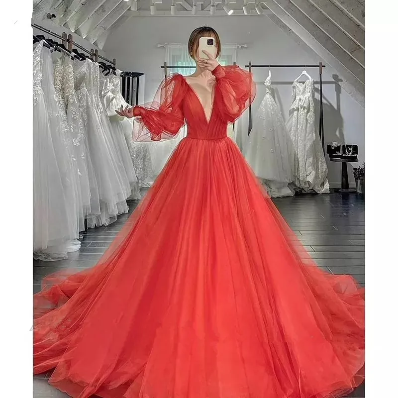 Элегантное Тюлевое свадебное платье принцессы А-силуэта светло-голубогокрасного цвета с V-образным вырезом и длинными рукавами женское платье длиной в Пол Robe De Mariage