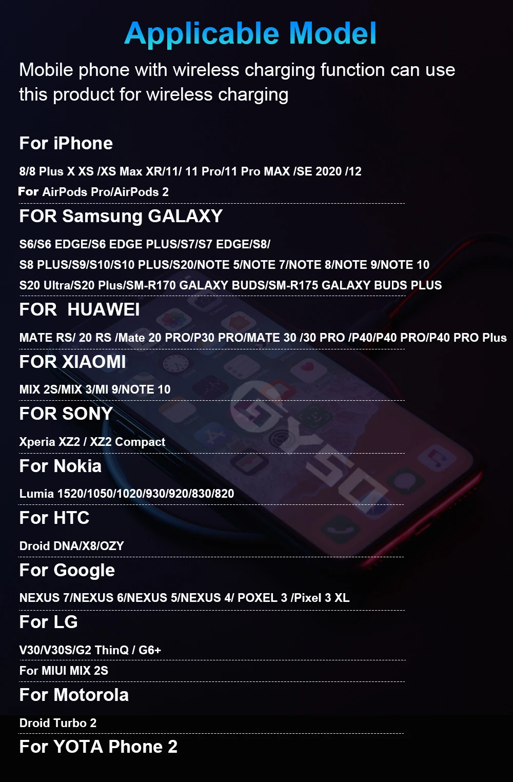 Быстрая Беспроводная зарядка: режим быстрой зарядки 40 Вт совместим только с Samsung Galaxy S20/S10/S9/S9 Plus/S8/S8 Plus/Note 9/Note 8/Note 5/S6 Edge/S7/S7 Edge и другие продукты серии Galaxy Note и Galaxy S, 7,5 Вт Быстрая зарядка совместима с iPhone 13/13 Pro/13 Pro MAX/13/12/12 Pro/12 Pro MAX/12/11/11 pro/X/XS MAX/XR, для iPhone8/8 plus, (Другие устройства с поддержкой Qi будут заряжаться со стандартной скоростью беспроводной зарядки).