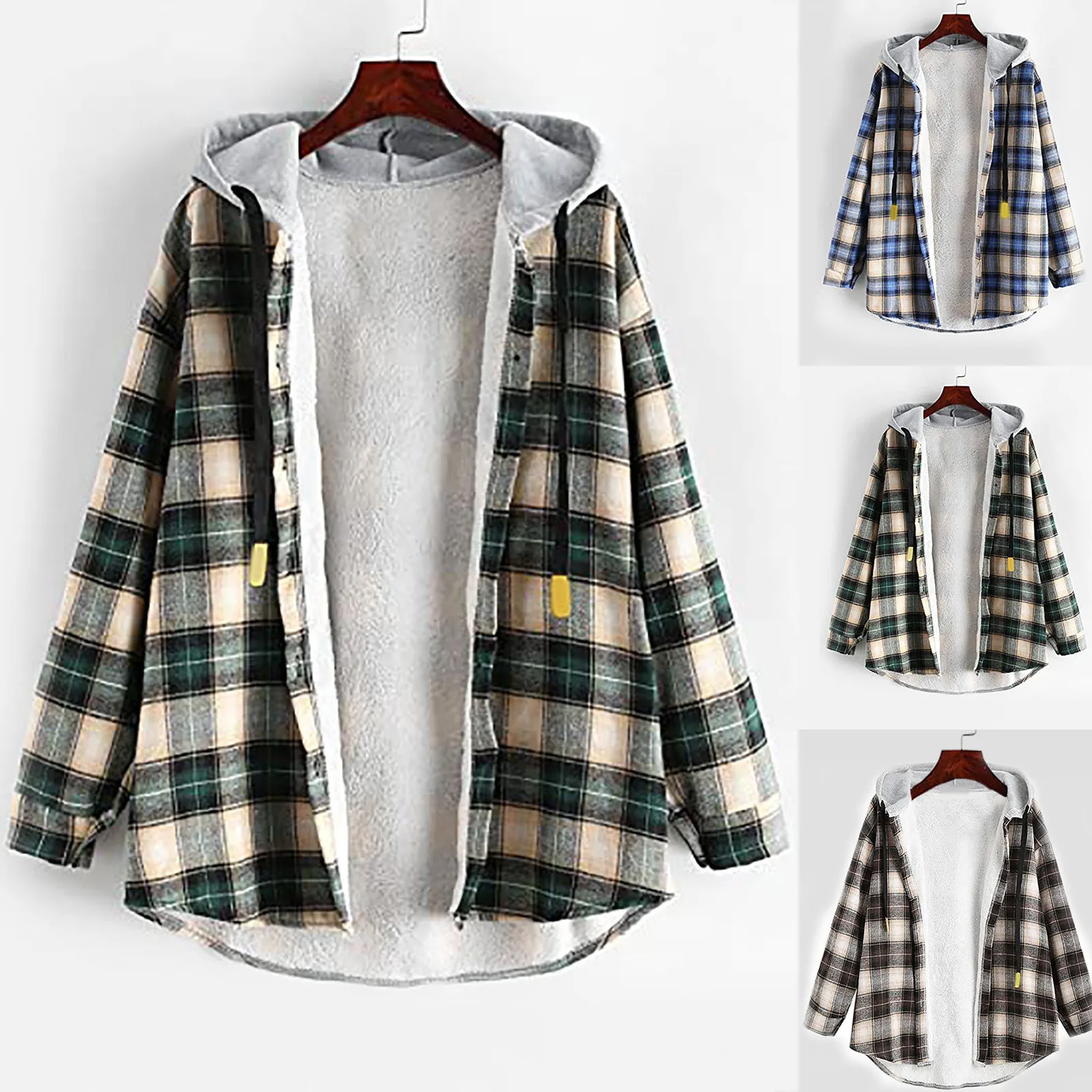 Женская Повседневная теплая куртка с длинным рукавом, клетчатая куртка с капюшоном, верхняя одежда
