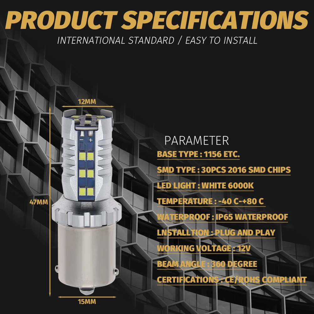 Товары включают:2 шт лампочкаРазъем 1: 1156 BA15S P21W светодиодныйРазъем 2: 1156 BAU15S PY21W светодиодныйРазъем 3: 1157 BAY15D P21/5W светодиодныйРозетка 4: 7440 T20 W21W светодиодный WY21WРазъем 5: 7443 T20 W21 5WРазъем 6: 3156 T25 P27WРозетка 6: 3157 T25 P27W 7WДля утверждения CANBUS:Этот светильник оснащен функцией CANBUS, 98% моделей не будут иметь мерцающий светильник или погрешность прибора. Если возникнут вышеуказанные проблемы, добавьте декодер canbus в лампу для решения проблемы. Если вы не согласны с этими правилами, пожалуйста, заказывайте внимательно, спасибо.Описание:1. Напряжение: DC12-18V2. Люмен: 2100 лм/лампа (белый)3. Мощность: около 21 Вт4. Тип светодиодный: 30 шт. 30SMD5. Цвет: белый 6500 к желтый красный6. Водонепроницаемость: IP68Этот светильник может использоваться только для поворотников, обратный светильник, тормозной светильник. Не может использоваться как головной светильник s, противотуманный светильник s, дневные ходовые огни светильник s!Светодиодный сигнал поворота автомобиля:1. 30SMD 2016 светодиодный шарик лампы, маленький размер и высокая яркость;2. Новый материал FPC печатная плата, монтажная плата мягкая и гибкая, и схема интегрирована. [Корпус лампы имеет защитную стеклянную крышку];3. Неполярное широкое напряжение постоянного тока дизайн источника: светодиодный сигнал поворота автомобиля может работать в маленьком автомобиле (DC12V-18v);4. Встроенная конструкция: штепсельная вилка и светильник без изменения цепи;5. Алюминиевые Детали активно рассеиваются, и эффект рассеивания тепла быстрый;6. Меньше паяльных соединений для улучшения качества продукцииЕсли вам нужно установить 4 шт. одновременно, очень небольшое количество автомобилей вызовет ошибку или проблему с гипервспышкой, пожалуйста, купите резистор вместе, чтобы решить проблему, 4 шт. лампочек нужны 1 пара резисторов 25 Вт.Примечание:1. Если лампочка имеет гипервспышку или ошибку, добавьте декодер резистора нагрузки.2. С источником питания 12 В постоянного тока, можно определить, работает ли сама лампа.3. Пожалуйста, подтвердите свою розетку перед заказом. Спасибо.