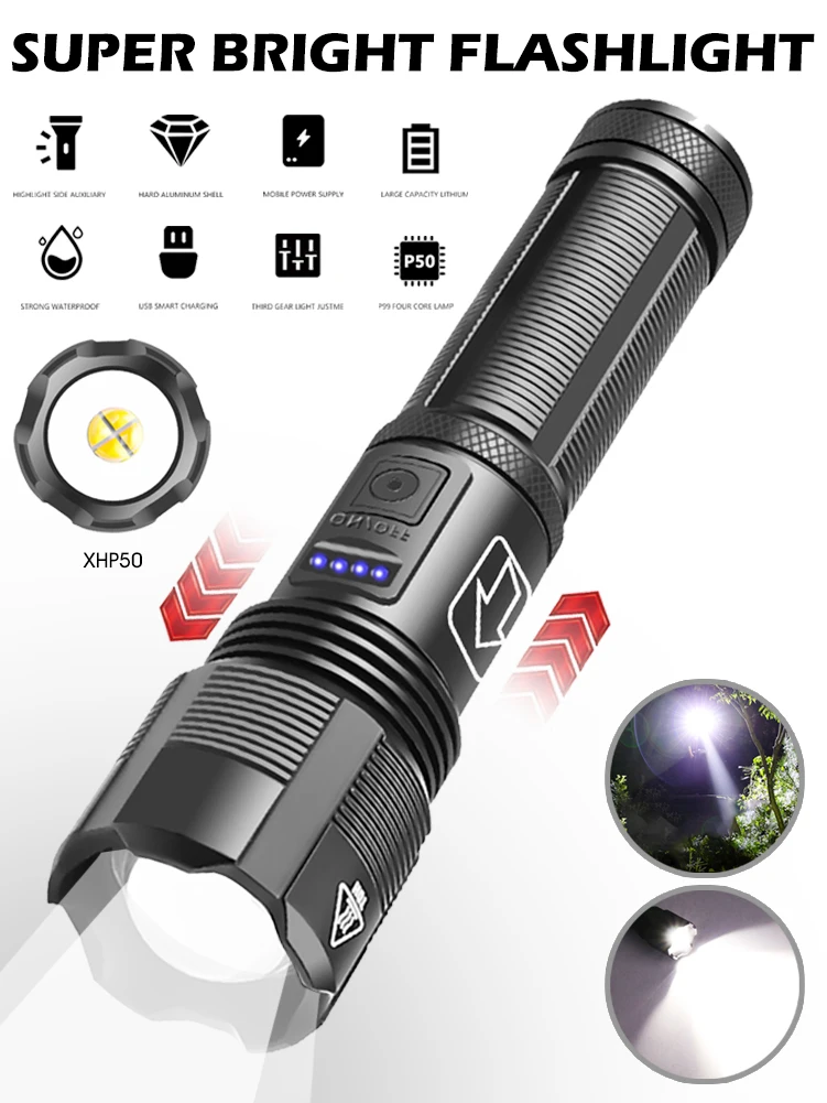 Тактифонарь охотничий фонарик XHP50XHP70, перезаряжаемый от Usb, масштабируемый фонарик с батареей 18650 AAA, водонепроницаемый