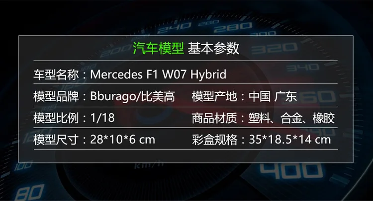 Bburago 1:18 Mercedes-Benz F1 W07 гибридная модель гоночной команды...
