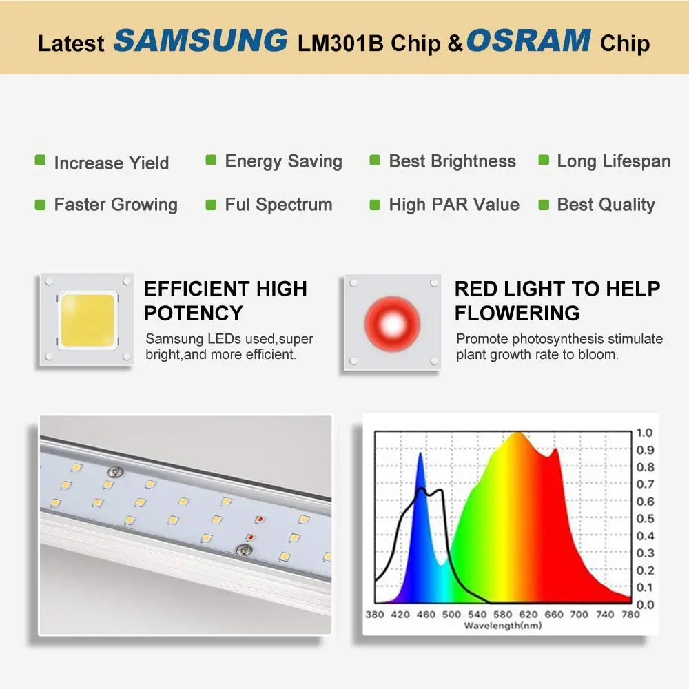 1. Свет роста растений состоит из 126 светодиодных чипов Samsung LM301B и 10 светодиодных ламп Osram 660nm. Подобно солнечному свету, он может эффективно способствовать росту листьев и корневищ и синтезу белков. Подходит для комнатных растений на различных этапах роста.2. Используя всемирно известный Средний источник питания, срок службы может быть до 7 лет.(Без затемнения)