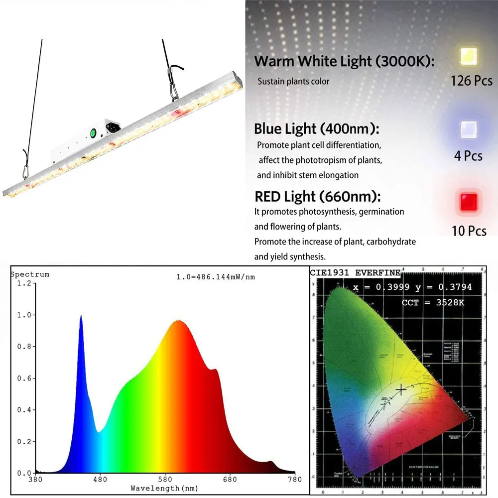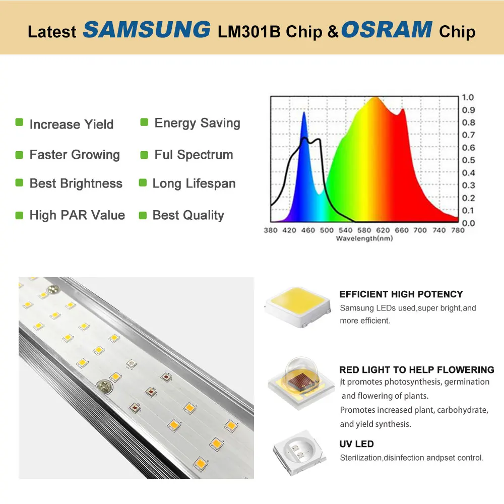 1. Свет роста растений состоит из 126 светодиодных чипов Samsung LM301B, 10 светодиодов Osram 660nm красный свет, который похож на солнечный свет и может эффективно способствовать росту листьев и корневищ и синтезу белков. Подходит для комнатных растений на различных этапах роста.2. Добавление 4 EPSTAR 440 УФ светодиодный чипы могут достигнуть влияний стерилизации, дезинфекции и борьба с вредителями. Способствует дифференциации растительных клеток, влияет на фототропизм растений и препятствует удлинению ствола3. Используя всемирно известный Средний источник питания, срок службы может быть до 7 лет.(Без затемнения)
