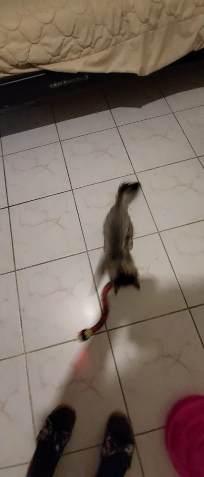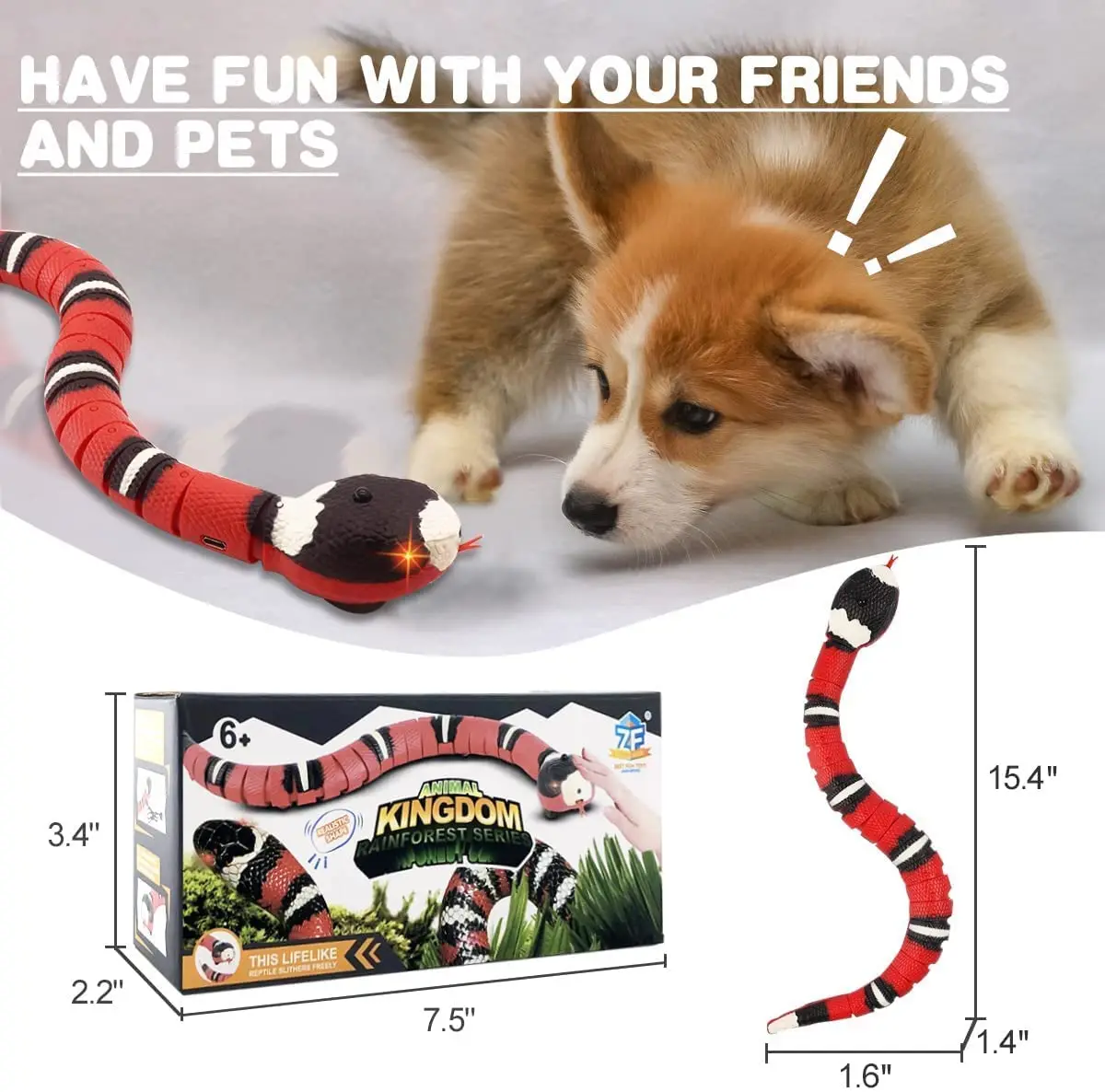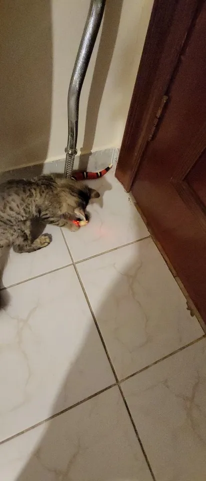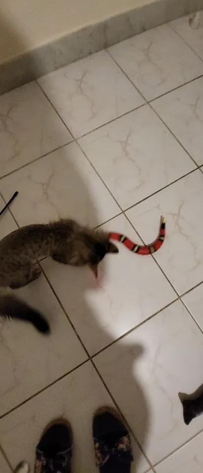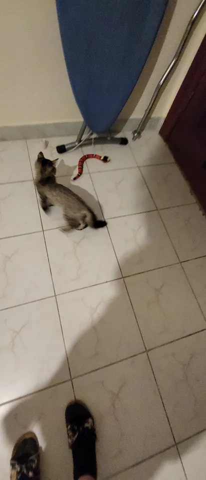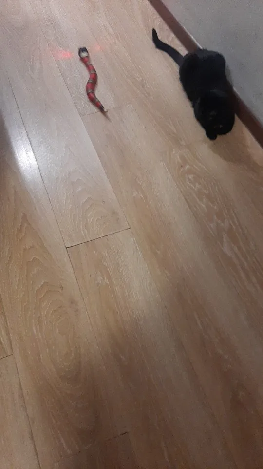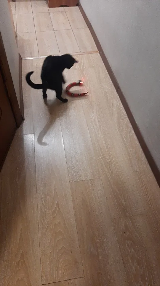 Змейка соответствует описанию. Бегает шустро, от препятствий уворачивается, на высокий ковер заезжает, но тяжело. Котики интересуются. Старший осторожничает, смотрит со стороны больше. Мелкая смелая бегает за змейкой, охотится, таскает ее за хвост.