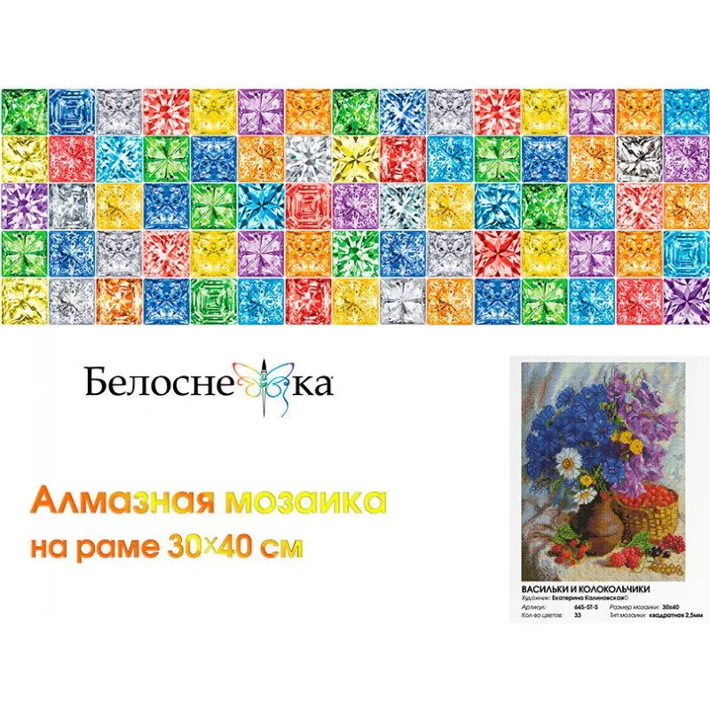 Блестящая картина из квадратных камней 2,5*2,5 мм. в размере 30*40 см. Основа картины – холст, натянутый на подрамник, для придания крепости конструкции подрамник усилен листом оргалита. На холст нанесена цветная схема с контрастными условными обозначениями, схему покрывает высококачественный клеевой слой, сверху слой закрыт пленкой. Комплект квадратных камней расфасован по цветам в отдельные пакеты, на каждом пакете есть наклейка с номером цвета и условным обозначением. Материал камней – композитный, на основе эпоксидной смолы, благодаря форме камней картина собирается без зазоров и по готовности получается красивое мерцающее изображение. Для этого размера дополнительно можно приобрести багетную раму.