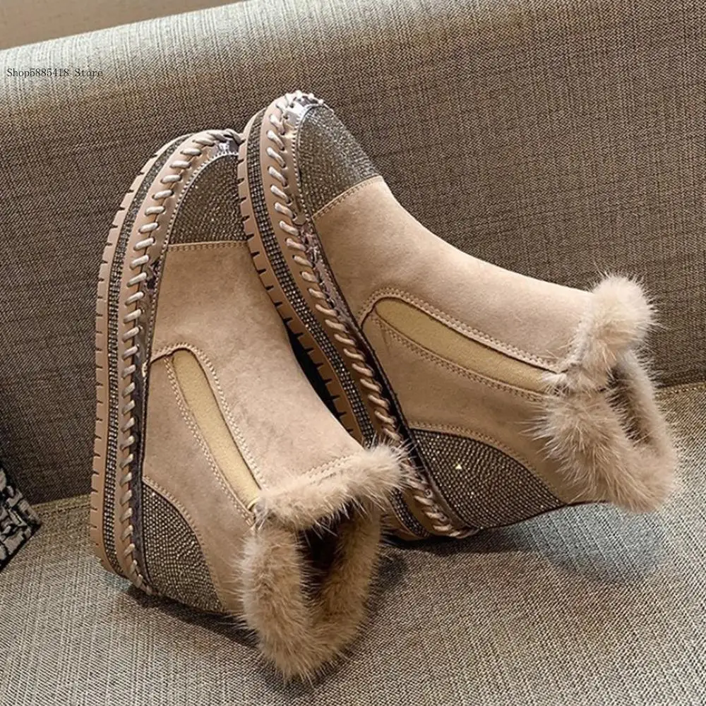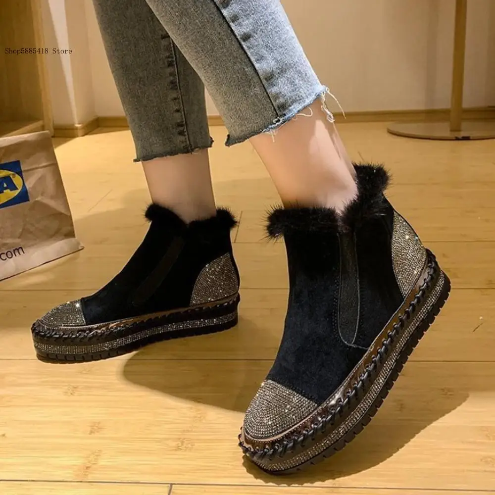 Женские Водонепроницаемые ботильоны на платформе, теплые зимние ботинки до щиколотки с натуральными волосами и кристаллами, на резинке, обувь на массивной подошве, большой размер 44