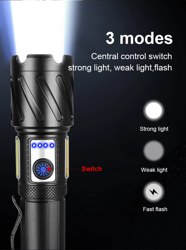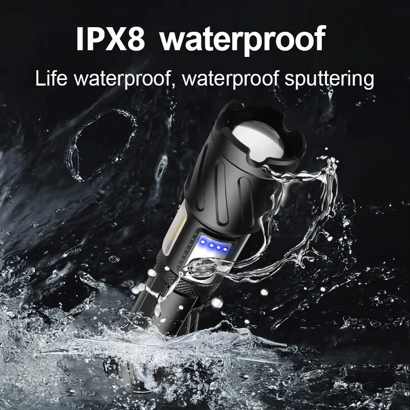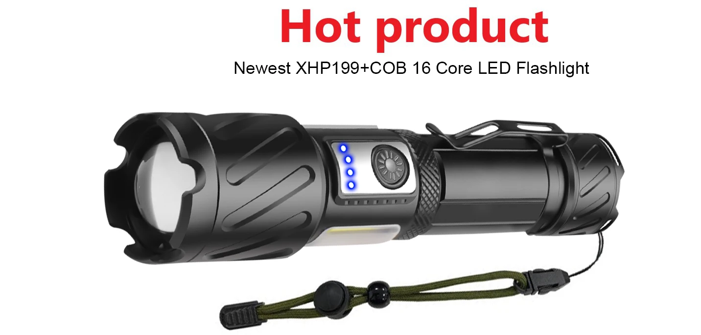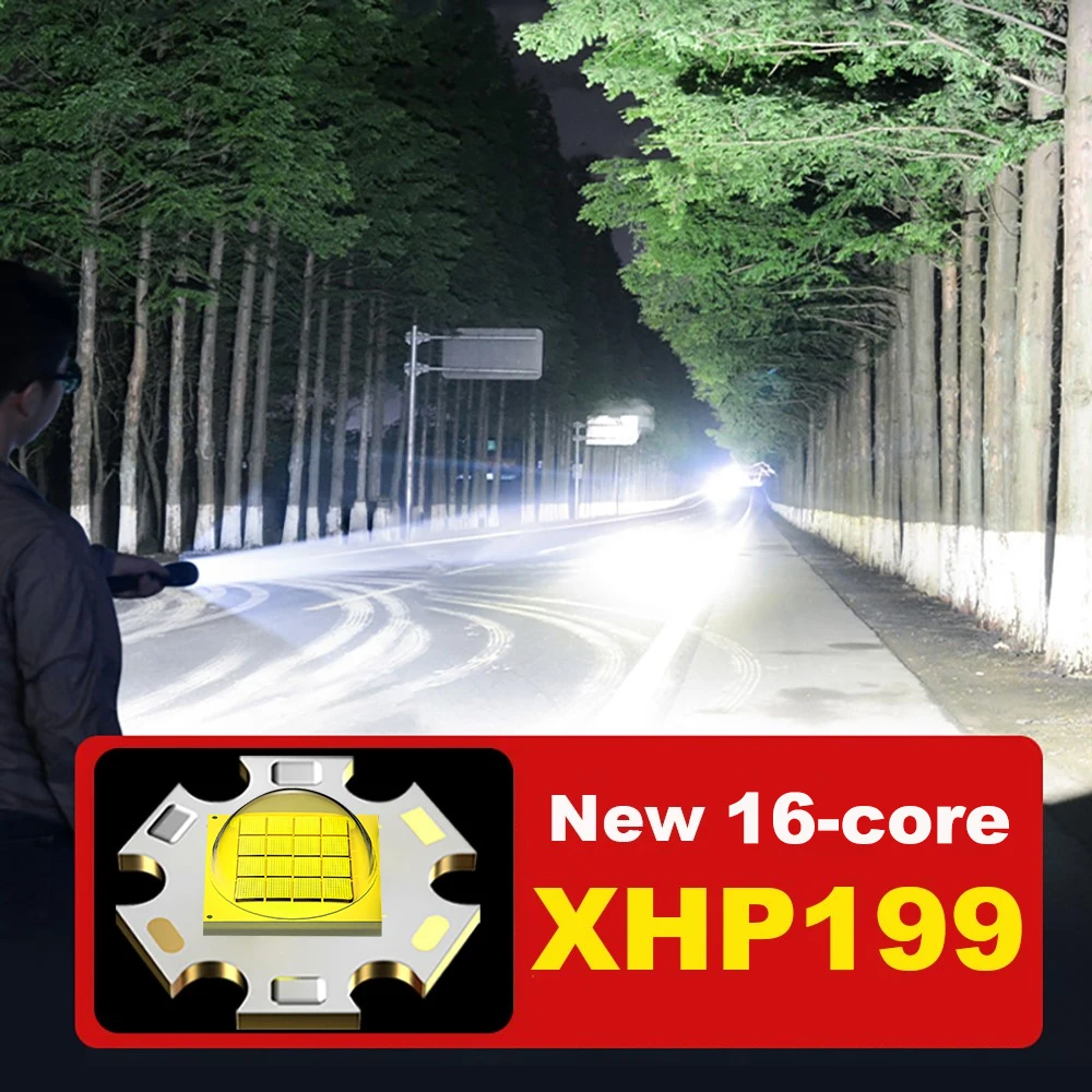 Aliexpress последняя супер мощный светодиодный фонарик использует новейшую Модернизированный XHP199 16-сердечник фитиль. Это самый мощный и Яркий фитиль на AliExpress. Его яркость выходит за рамки воображения, а расстояние освещения превышает 1600 метров. COB боковой светильник светодиодный желтый светильник, белый светильник, красный светильник, мигающий три COB Последние функции. Использование новейшей модернизированной батареи 18650 или 26650 может использоваться непрерывно в течение 6-15 часов. Хвост имеет магнитное притяжение, что очень удобно. Это первый выбор для семьи и различных видов активного отдыха.