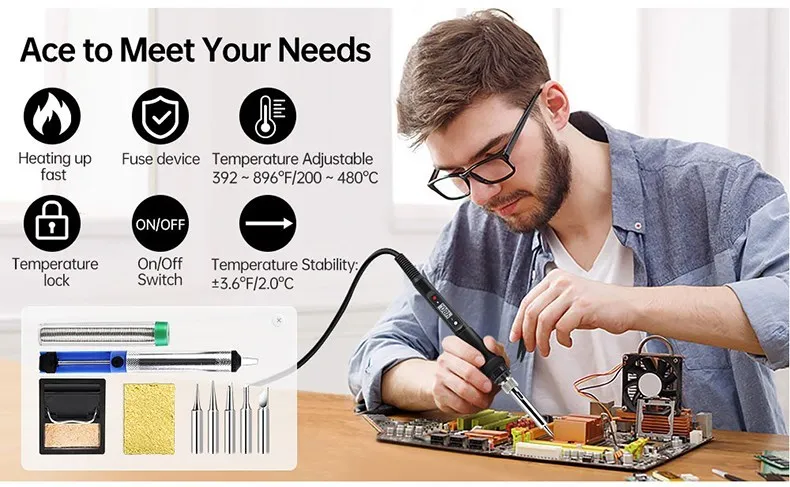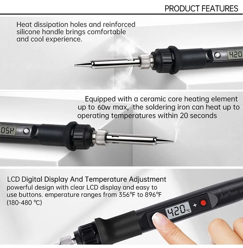 Этот паяльник является 80 Вт сварочным инструментом, который может работать в 180C -480C. Температура может быть скорректирована 1С. Он имеет штепсельную вилку ЕС и США на выбор.