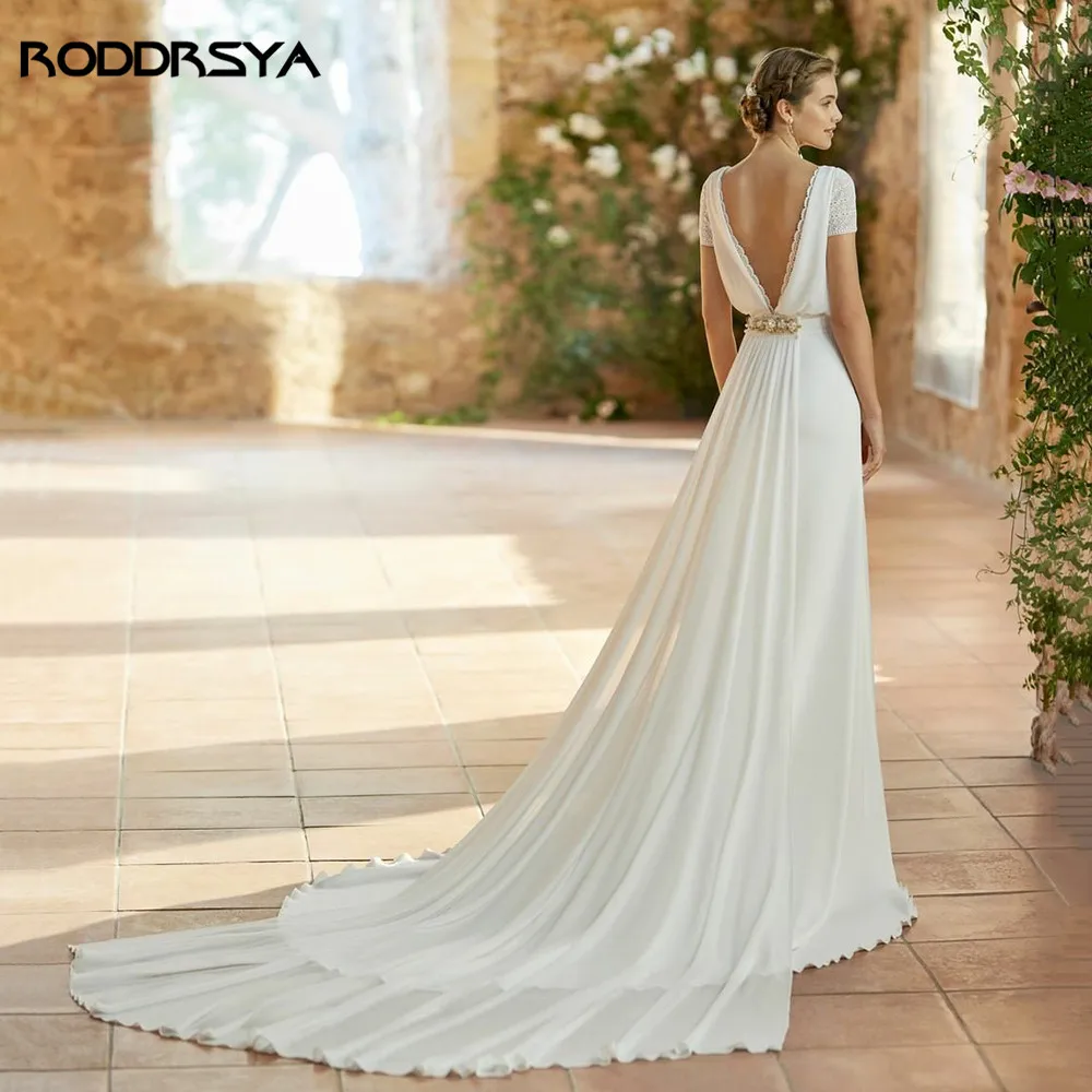 Шифоновое свадебное платье RODDRSYA в стиле бохо, шифоновое кружевное платье А-силуэта с глубоким круглым вырезом и коротким рукавом, с открытой спиной, со съемным шлейфом