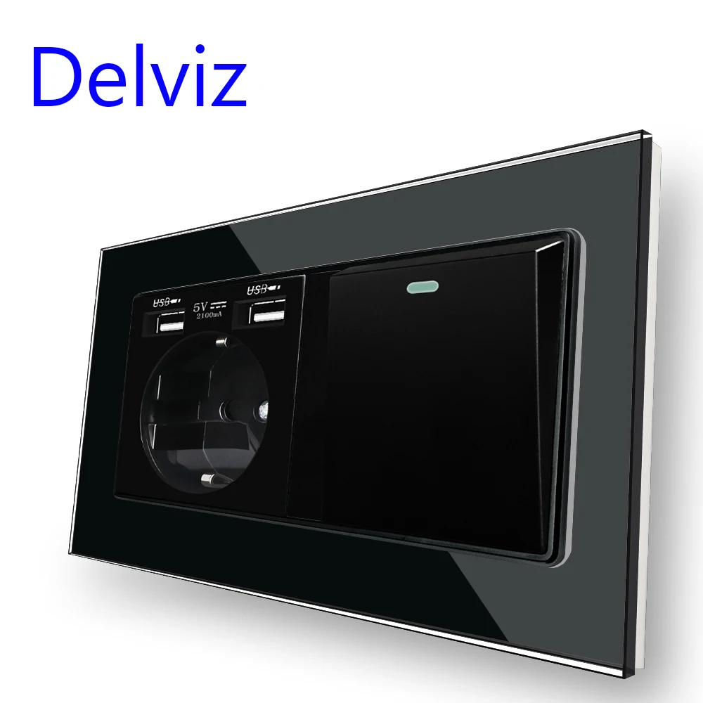 Настенная розетка Delviz с двумя USB-портами, кнопочный переключатель на 1 клавишу, 2 канала1 канал, белая прозрачная стеклянная панель, высветильник ель питания европейского стандарта 16 А