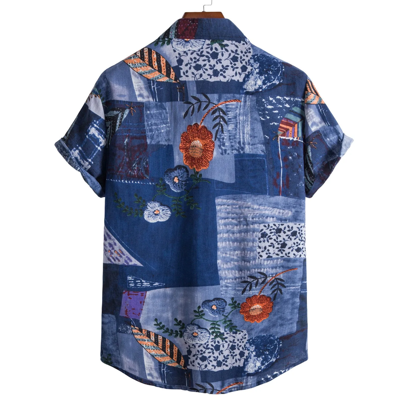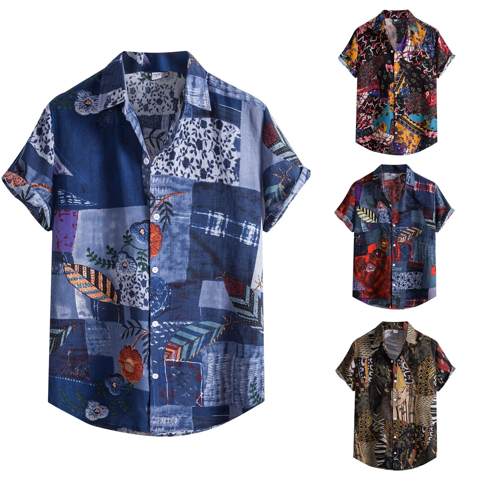 Рубашка Мужская льняная с коротким рукавом, свободная мешковатая блузка с цветочным принтом, повседневная Пляжная футболка для Гавайских праздников, топы на пуговицах, на лето