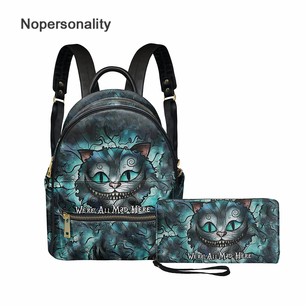 Комплект женских сумок и кошельков Nopersonality с принтом Чеширского кота на Хэллоуин, 2 шт., кожаный рюкзак и кошелек для денег, комплект из Сумки из искусственной кожи и клатча