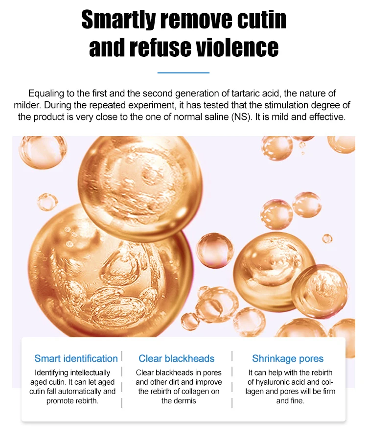 Приравнивается к первому и второму поколению тартарной кислоты, природе мягче. Во время повторного эксперимента, он проверил, что степень стимуляции продукта очень близка к одному из нормальных соленых (NS). Он мягкий и эффективный.▶Интеллектуальная идентификацияОпределение интеллектуально состаренного кутина. Он может автоматически выдержать старение cutin и способствовать возрождению.▶Прозрачные черные головкиЧистые Угри в порах и других загрязнениях и улучшают возрождение коллагена на дерме▶Усадка порЭто может помочь с Возрождением гиалуроновой кислоты, коллагена и пор будет твердым и тонким.