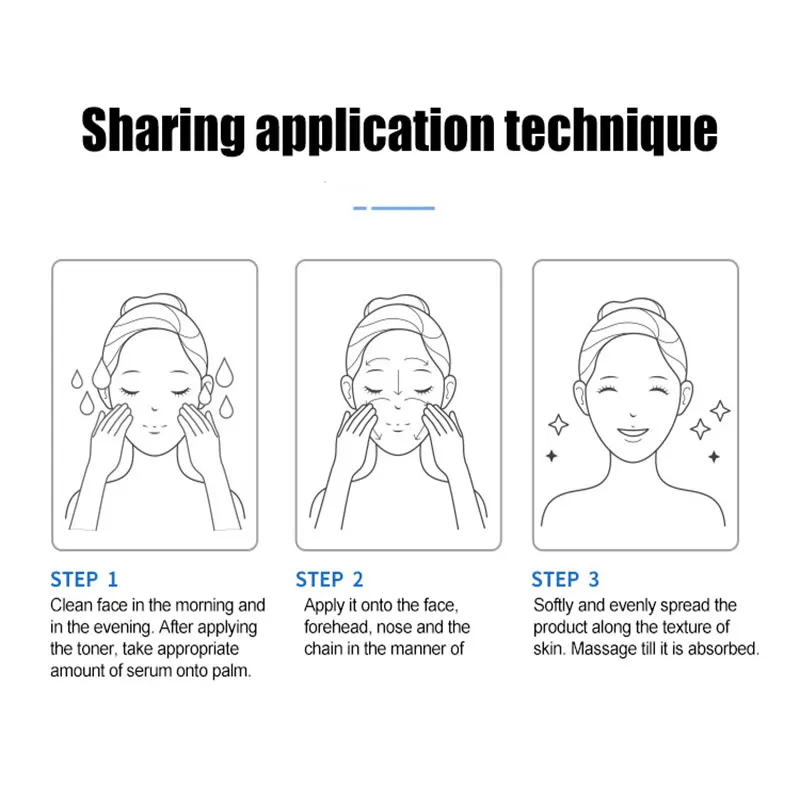 ▶Шаг 1: очистите лицо утром и вечером. После нанесения тонера Возьмите необходимое количество сыворотки на ладонь.▶Шаг 2: Нанесите его на лицо, лоб, нос и цепочку в виде заточки.▶Шаг 3: мягко и равномерно распределите изделие по текстуре кожи. Массаж до впитывания.