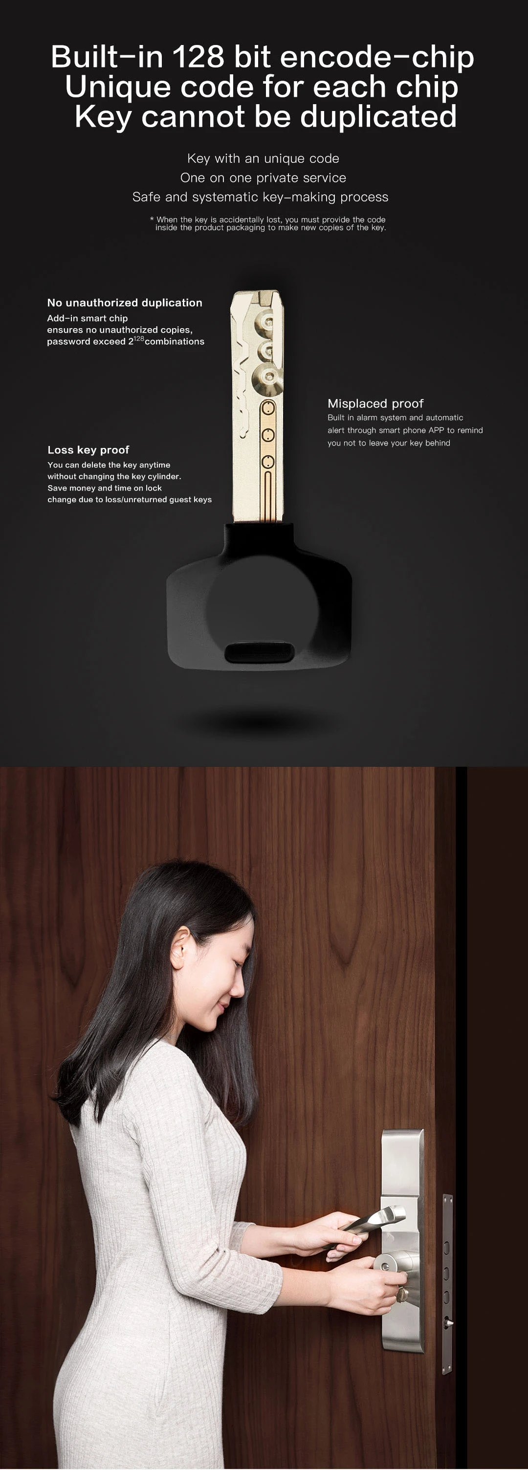 Этот замок является интеллектуальным электронным замком, ключи встроены в смарт-чип. Он сохранит ваш дом в безопасности. Вам нужно использовать электронный ключ для блокировки/разблокировки. Вы не можете управлять блокировкой с помощью приложения для телефона, но вы можете управлять ключами и проверять запись блокировки с помощью приложения. Вы также можете добавить блокировку в ваш умный дом с помощью приложения.