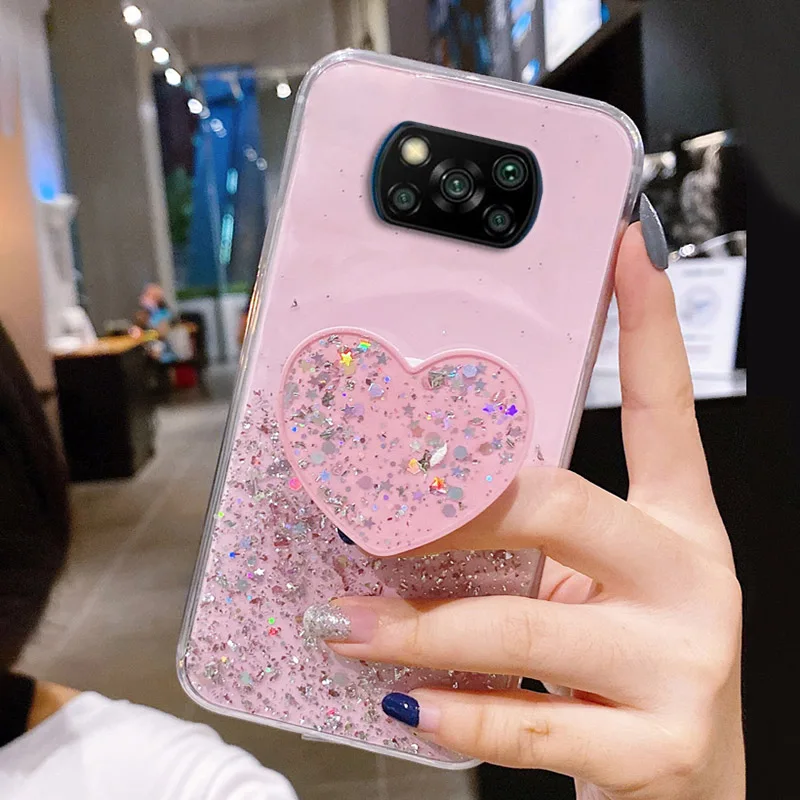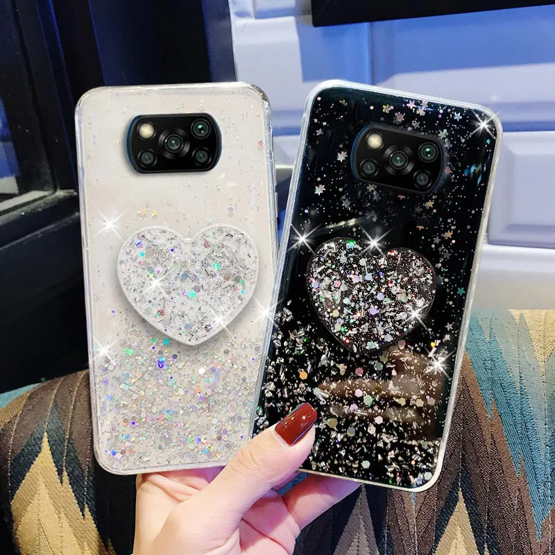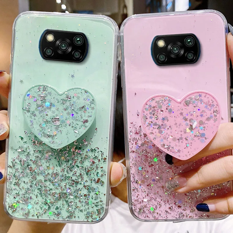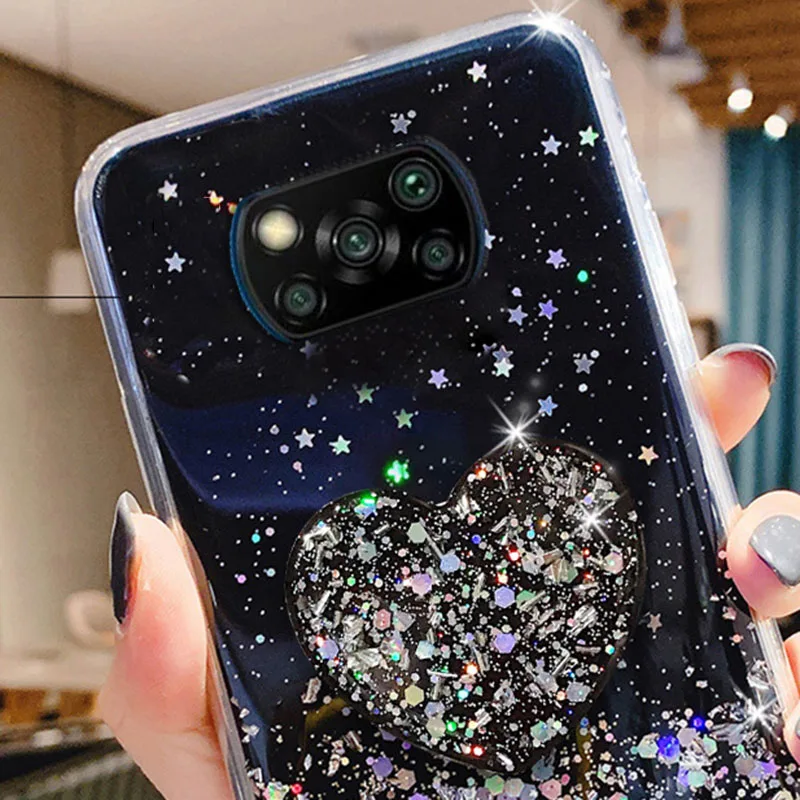 Чехол Funda Poco X3 NFC Pro, роскошный блестящий чехол для Xiaomi Poco X 3 F3 M3 M4 F2 Pro X3Pro, чехол-подставка для телефона с держателем в виде сердца