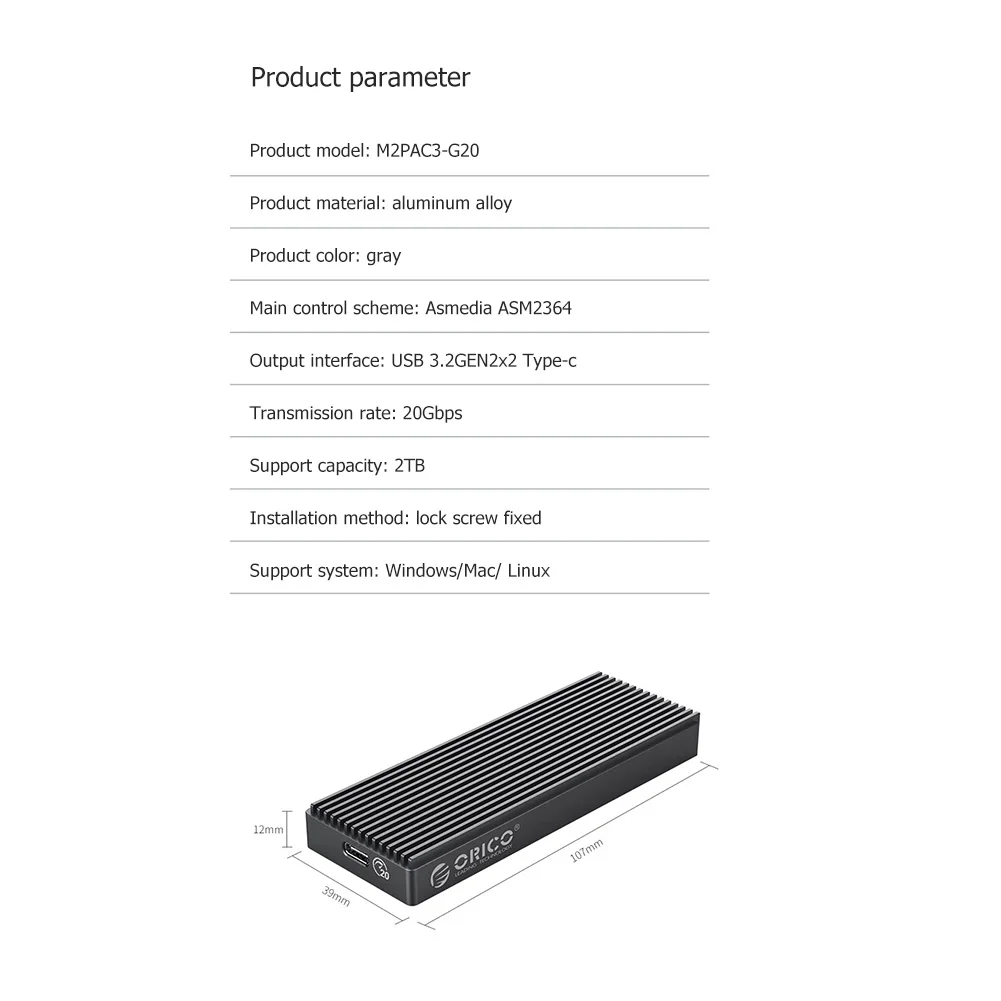 Корпус внешнего накопителя ORICO USB 3,2 Type-C, 20 Гбитс
