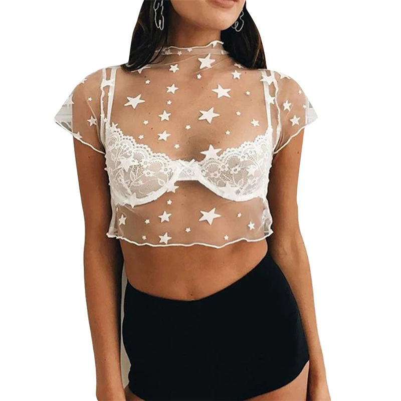 Кроп-Топ женский прозрачный, сетчатый топ с коротким рукавом, черепаха, звезда, рандомный кроп-топ, свободная повседневная майка