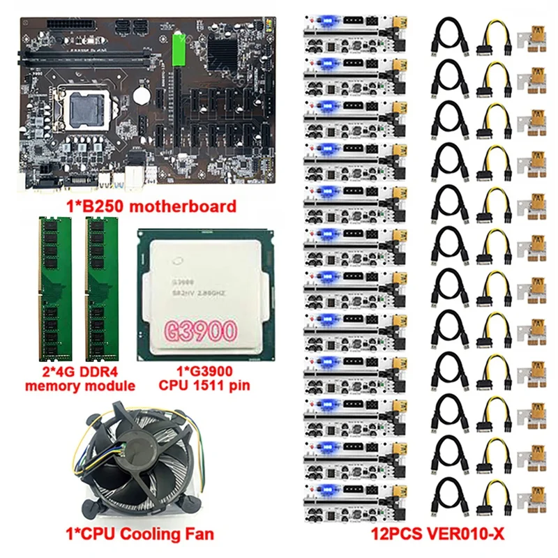 B250 BTC горная материнская плата 12 GPU LGA1151 DDR4 DIMM с 12X010-X PCIE Riser Card + 1XG390 0 CPU + 2X DDR4 RAM + охлаждающий вентилятор
