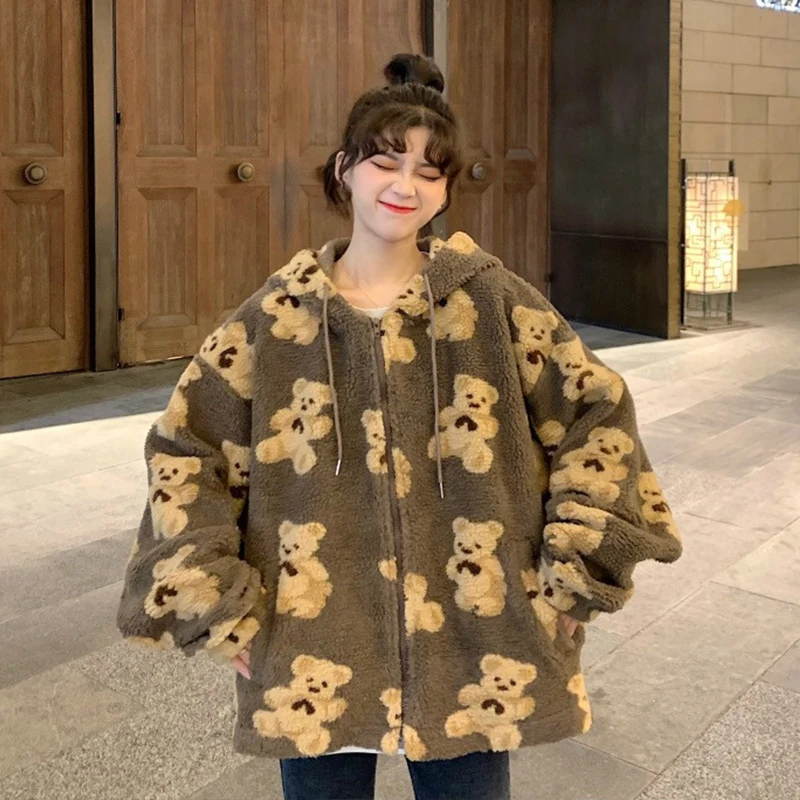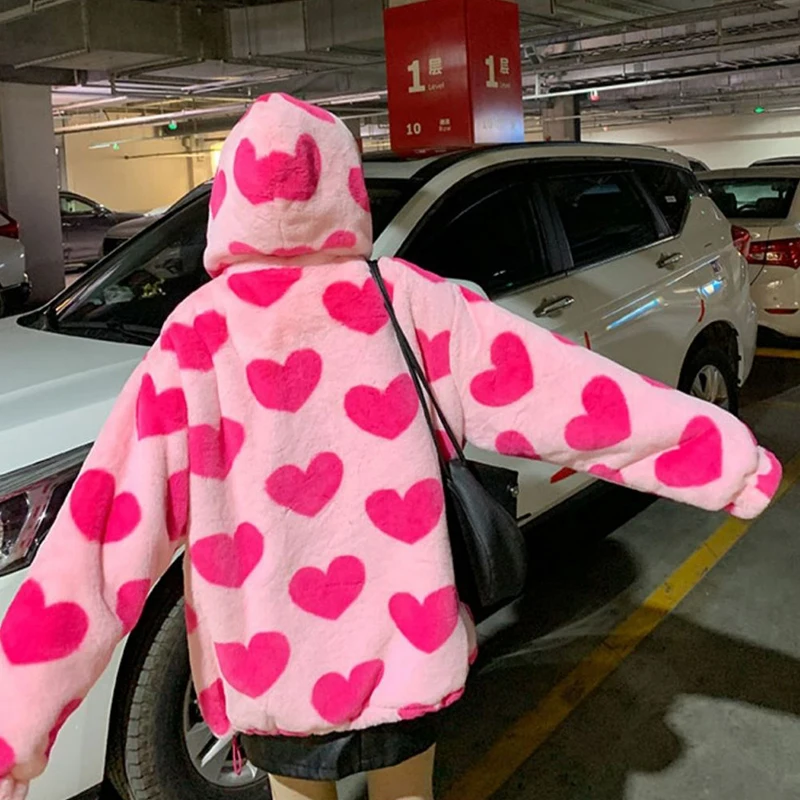 Женское зимнее пальто с капюшоном в Корейском стиле, пальто большого размера с длинным рукавом и принтом в виде сердца в стиле 90-х, плюшевая куртка в стиле Харадзюку, Толстая теплая уличная одежда для пар