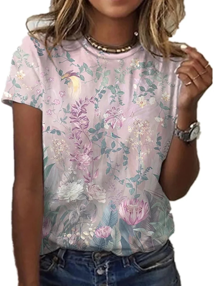 Женская футболка с коротким рукавом, круглым вырезом и цветочным принтом