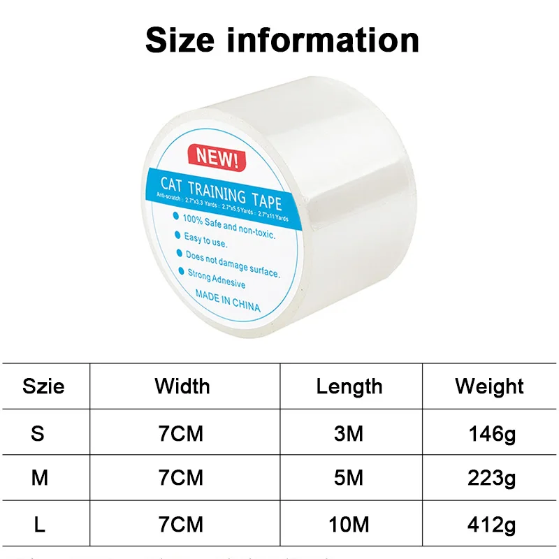 Тип: скретч-лента для кошек Цвет: прозрачный Размеры S:300*7 см M:500*7 см L:1000*7 см Материал: прозрачный акриловый клей Подходит для: обучение когтеточке для домашних животных, защита для мебели