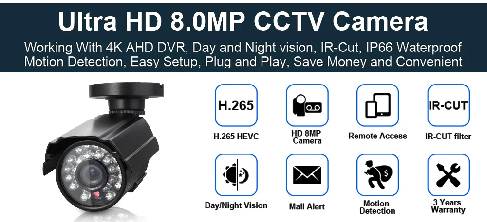 1, Ультра HD 4K дисплей высокой четкости;2. Ультра HD 8MP AHD камера, металлический материал, IP66 водонепроницаемый, подходит для внутреннего и наружного использования; Пыленепроницаемый, надежный для домашней безопасности;3. Улучшенное H.265 Сжатие видео, подключи и работай, простота установки;4. Поддержка распознавания лица, записи лица, воспроизведения лица, обеспечивает ультра высокое разрешение видео наблюдения, обеспечивая максимальную детализацию и четкость доступны;5. Поддержка ночного видения Ultra HD, расстояние передачи составляет 500 метров;6. Поддержка IR-CUT переключателя двойного фильтра, днем и ночью для достижения мониторинга, цвет не является частичным искажением цвета;7. Поддержка обнаружения движения, оповещения по электронной почте, воспроизведения видео;8. Поддержка Android,Iphone,Ipad, ПК, P2P просмотра;9, удаленный доступ в любом месте, в любое время;