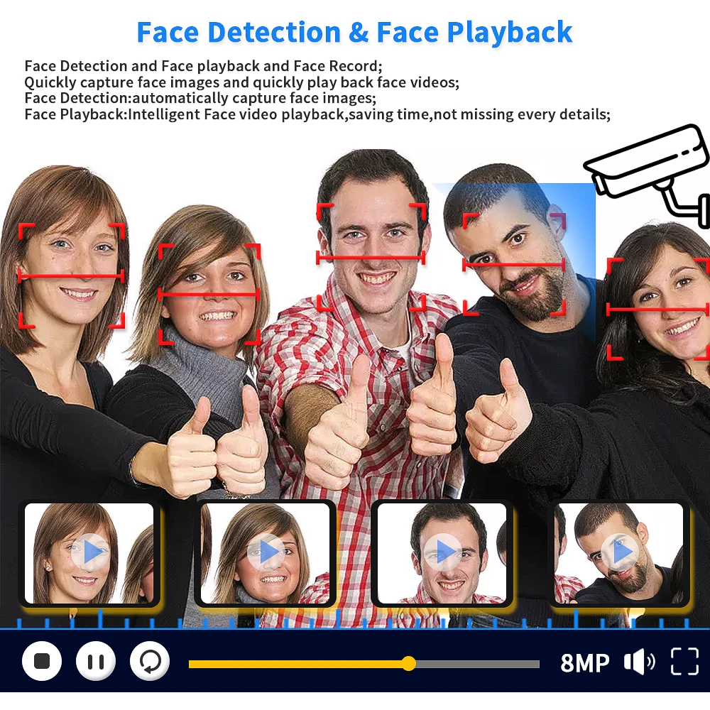 Распознавание лица, воспроизведение лица и запись лица; Быстрое снятие изображений лица и быстрое воспроизведение видео лица; Распознавание лица: автоматическое снятие изображений лица; Воспроизведение лица: интеллектуальное воспроизведение видео лица, экономия времени, не пропустите все детали;
