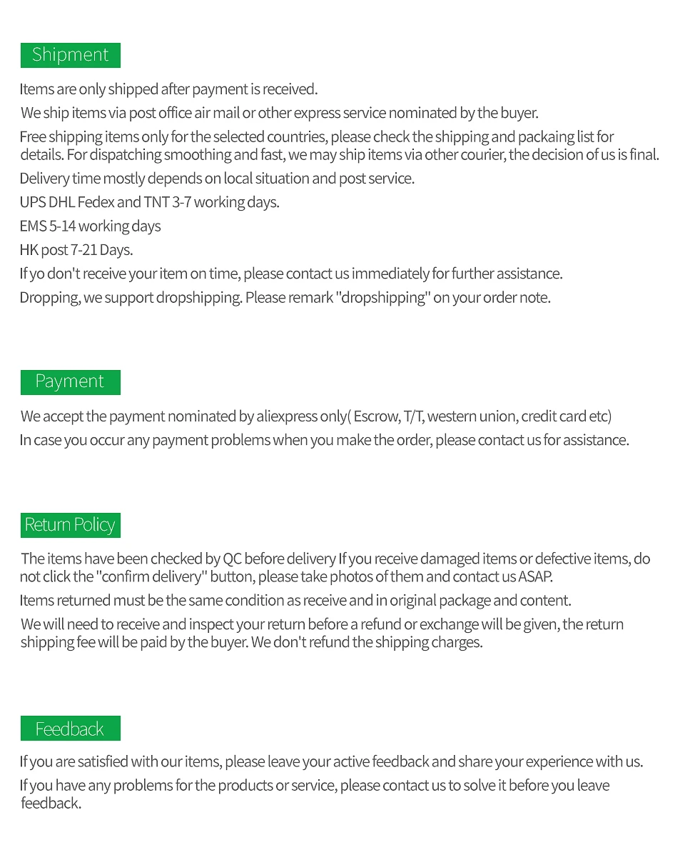 Aliexpress предлагает всем продавцам предоставить время доставки по всем направлениям доставки, поэтому мы, как продавец, предоставили покупателям приблизительное время доставки по каждому пути доставки, в большинстве случаев, большинство посылок могут быть доставлены в течение указанного времени, Мы надеемся, что вы знаете, что всегда есть некоторые ненепредвиденные проблемы для международной перевозки, проблемы включают, но не ограничиваются этими ниже: 1: Ваша посылка возвращается, и мы отправим вам еще один, это занимает больше времени; 2: Ваша посылка отклоняется почтовым отделением или таможней, Для уточнения вопросов или отправки посылки требуется больше времени; 3: Ваша посылка задерживается на таможне (ТАМОЖНЯ CN или таможня вашей страны), требуется больше времени, чтобы предоставить файлы, чтобы они выпустили посылку; 4: Ваша посылка потеряна в пути, и мы повторно отправим другую посылку, это займет гораздо больше времени; 5: Ваша посылка задерживается во время китайских традиционных праздников и традиционных праздников вашей страны и международных праздников, таких как китайский традиционный праздник по уборке гробниц; Праздник лодок дракона; Праздник середины осени; китайский национальный день; Праздник Весны и т. Д. Это занимает больше времени из-за этих праздников; 6: Ваша посылка задерживается из-за некоторых форс майресов, которые включают, но не ограничиваются тяжелой погодой, природными катаклизмами или проблемами аэропорта и т. д. это занимает больше времени. И так .............