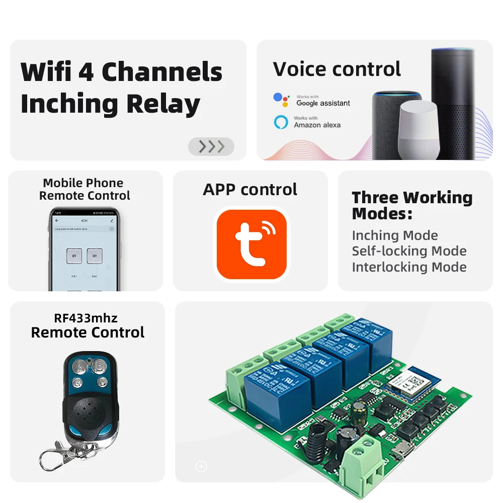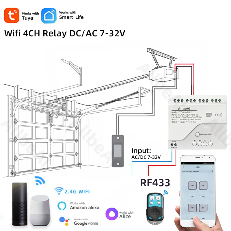Умный Wi-Fi модуль 4CH Tuya для открывателя гаражных дверей, релейный блок на 5 В, 12 В, 32 В постоянного тока, 4-канальный Радиочастотный пульт дистанционного управления Alexa Alice 433 МГц