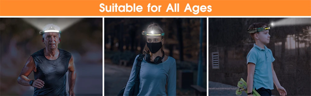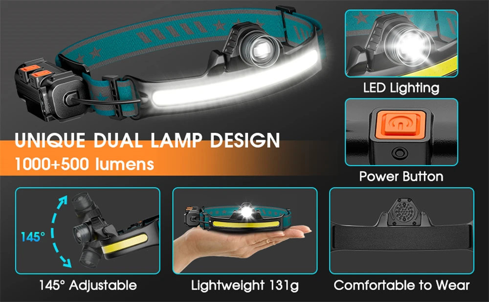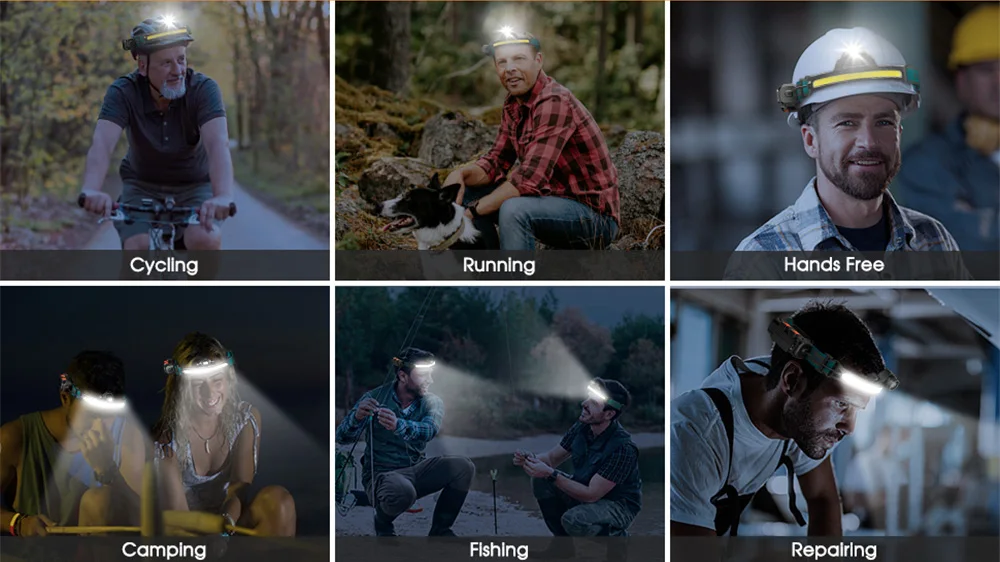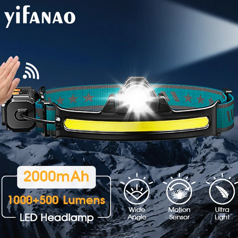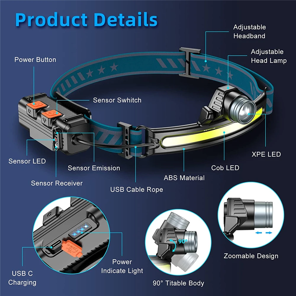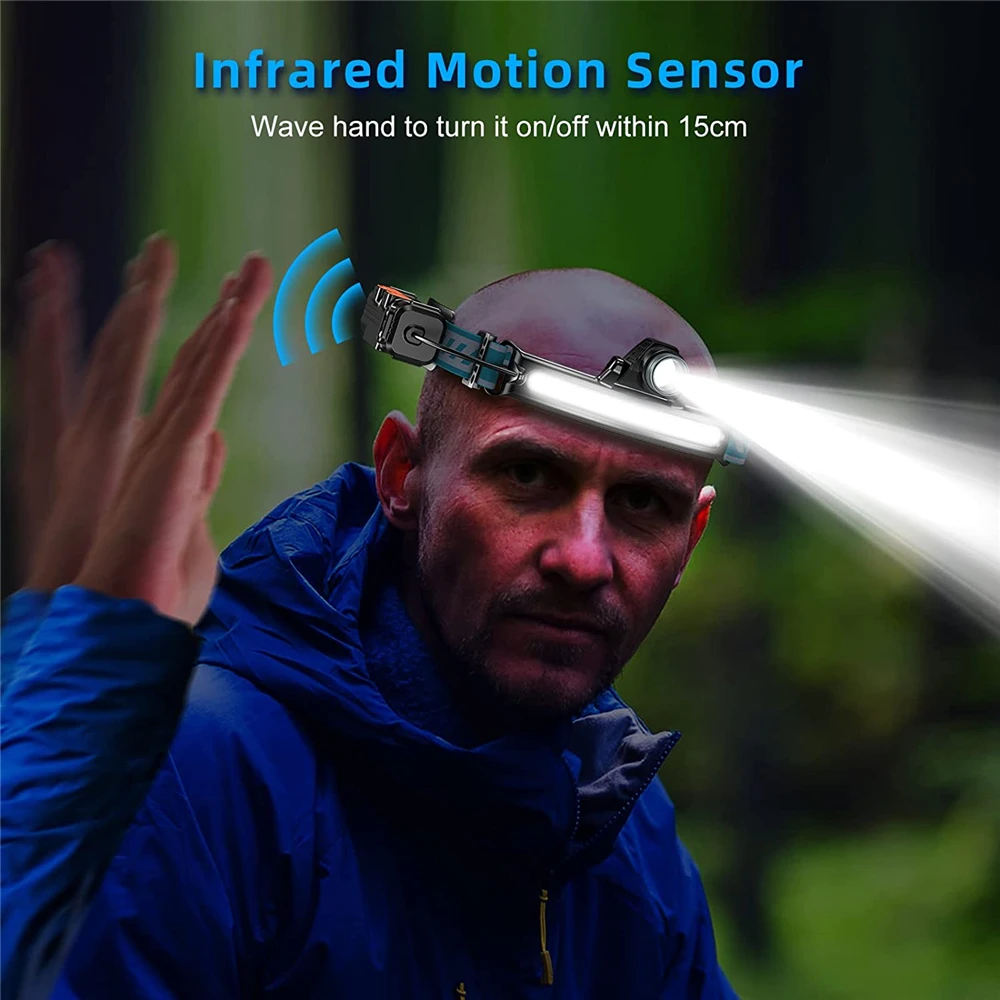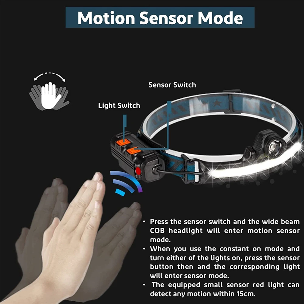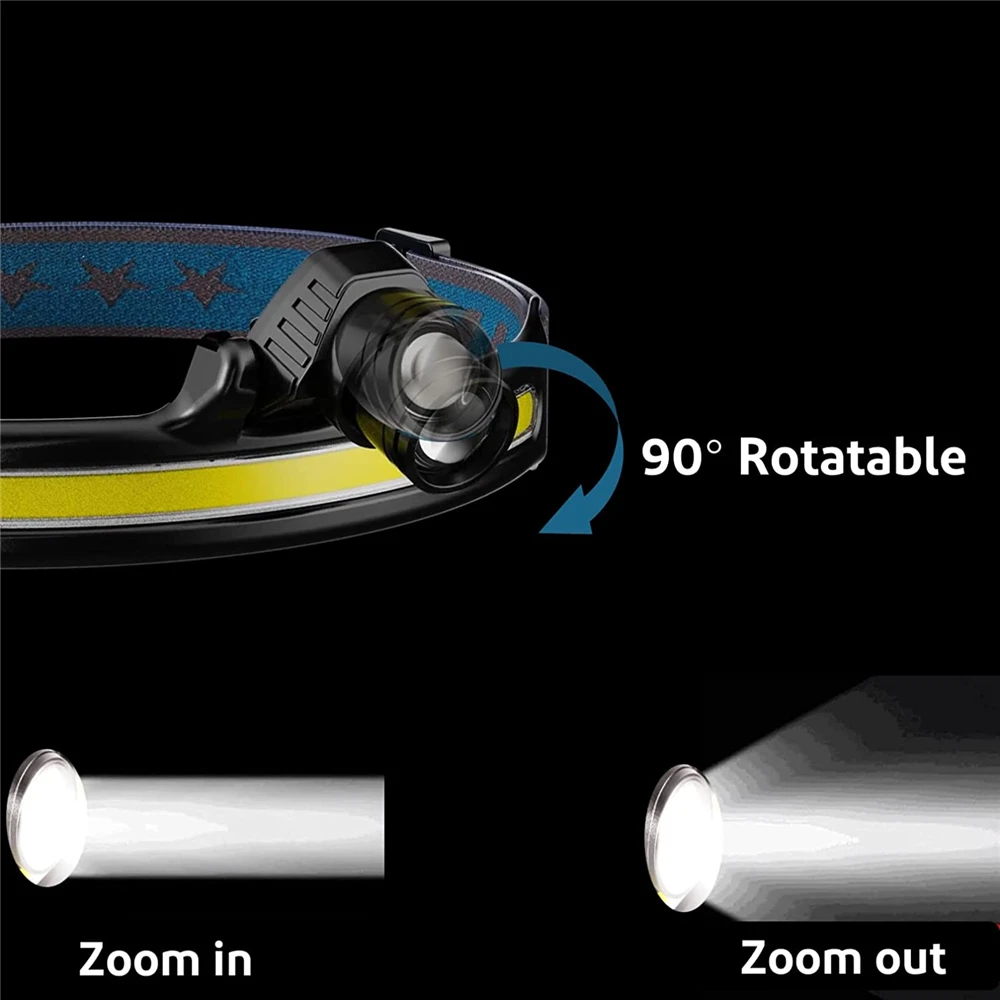 Индукционный налобный фонарь с COB матрицей, 6-режимный Головной фонарь с аккумулятором, Аккумуляторный водонепроницаемый головсветильник светильник, фонарь с зумом для кемпинга, освещение для палатки, рыбалки