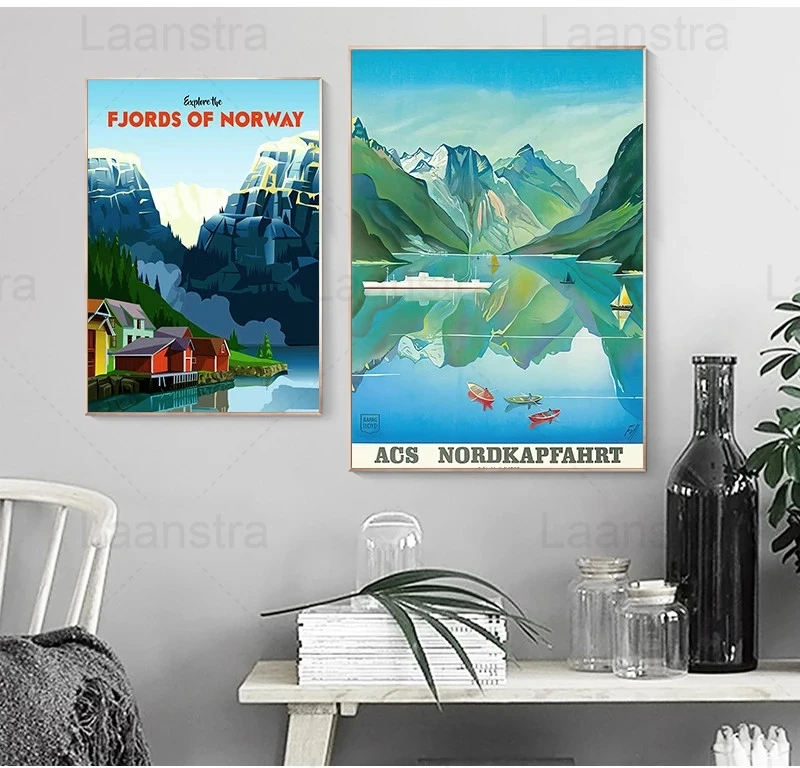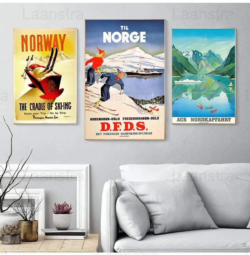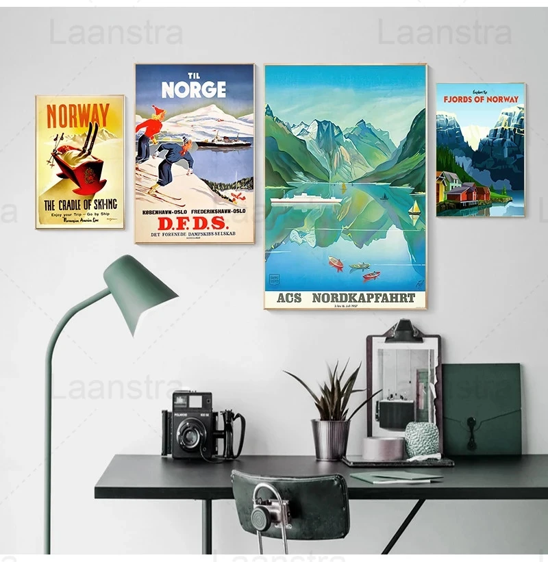 Карта фьордов в норвежском стиле лыжи в винтажном стиле ретро путешествия Классический Холст искусственная стена домашний декор семейные подарки