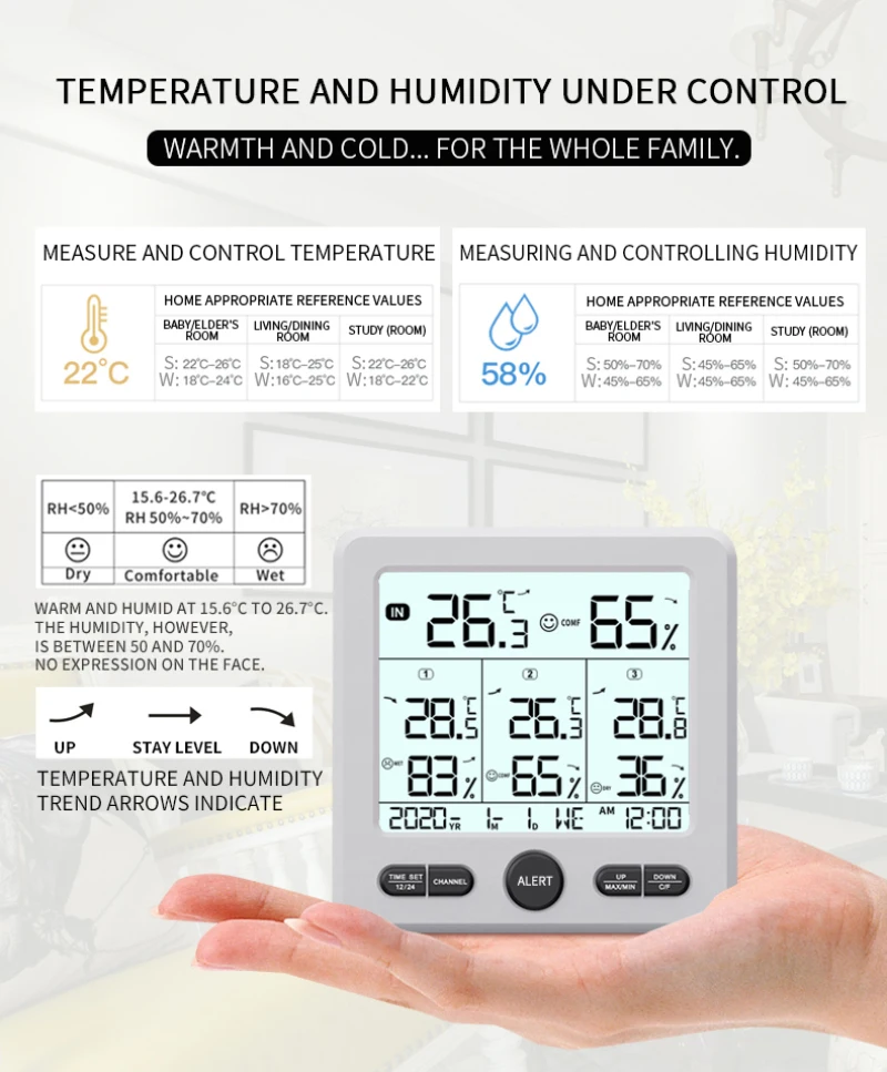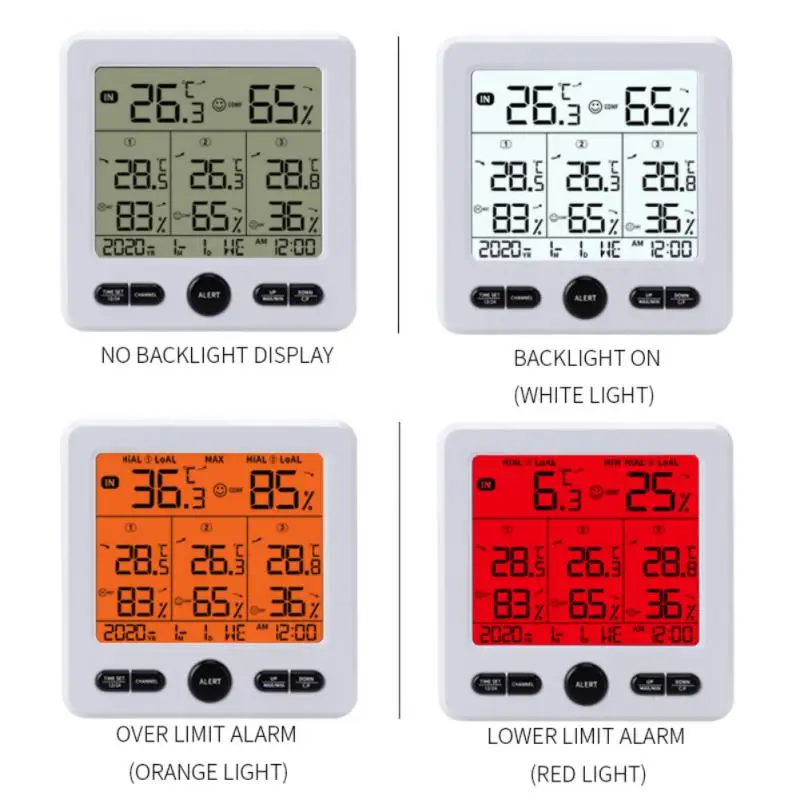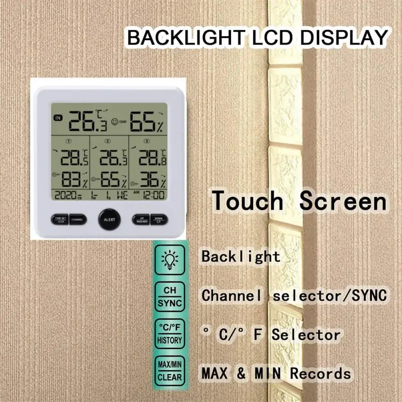1. Может отображать три канала и температуру в помещении и влажность в то же время, трехуровневый дисплей для комфортного использования в помещении