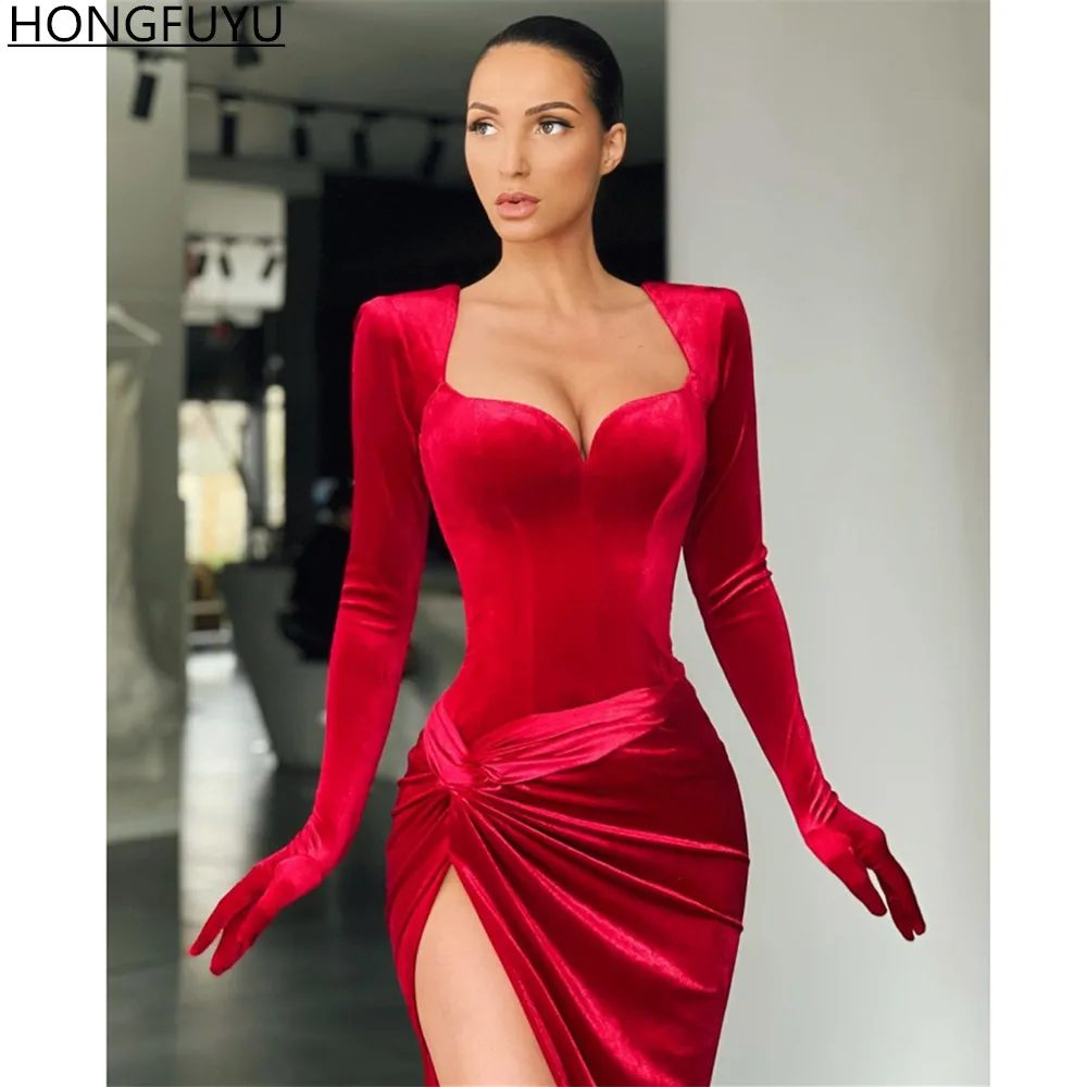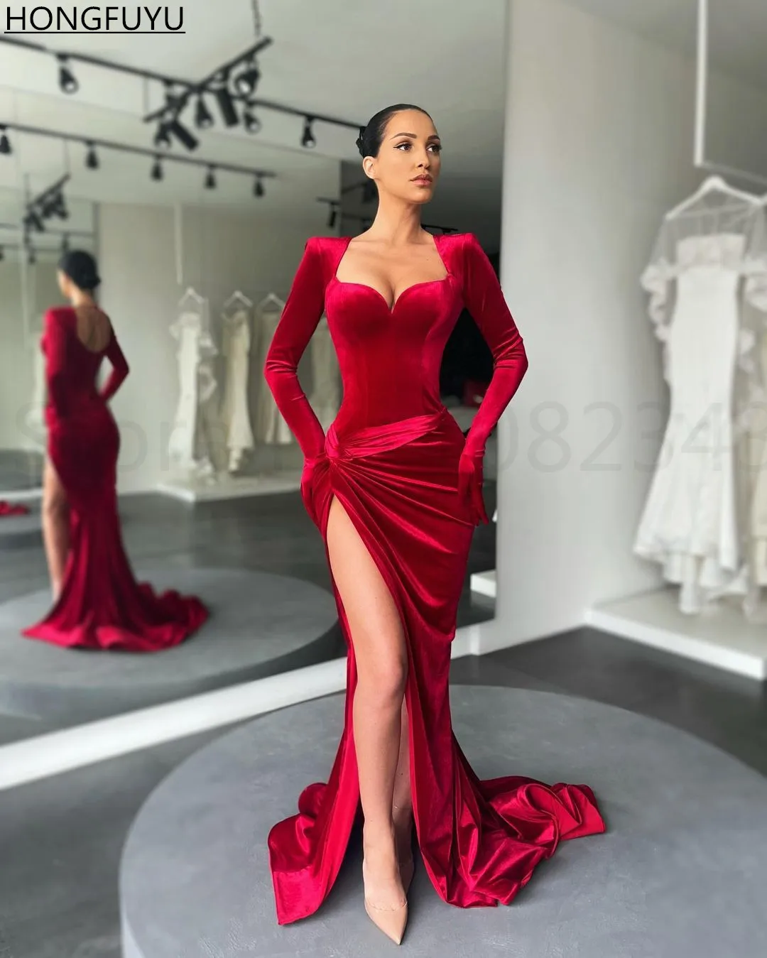 HONGFUYU красное женское платье для выпускного вечера, платье с длинным рукавом, вечернее платье с разрезом сбоку, драпированные вечерние платья, Новинка