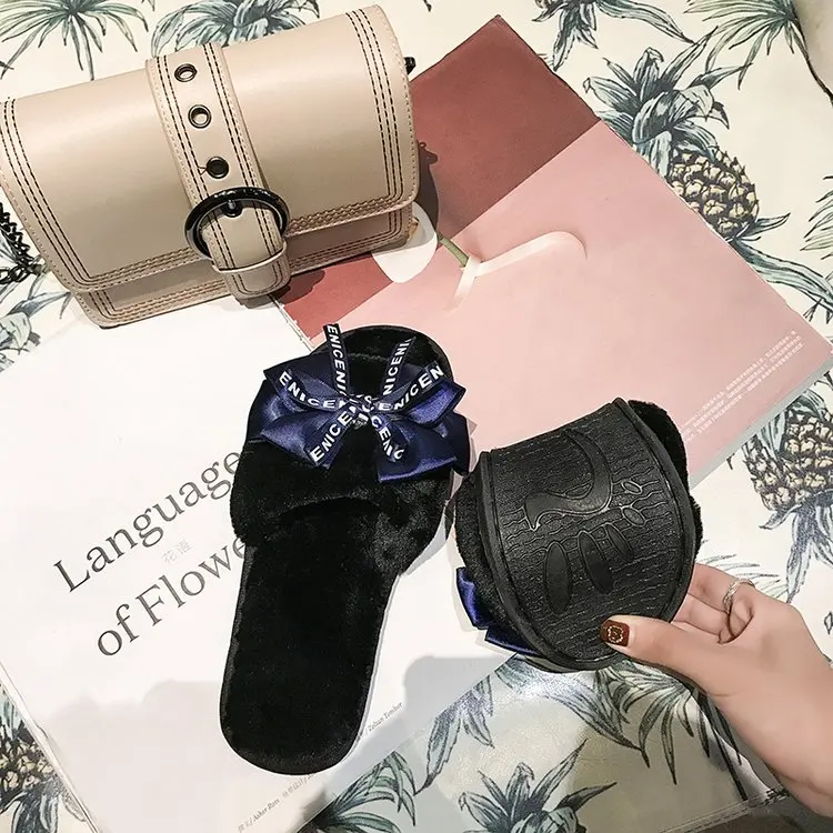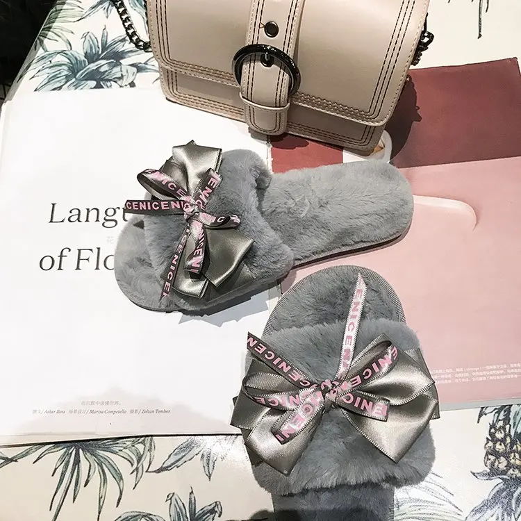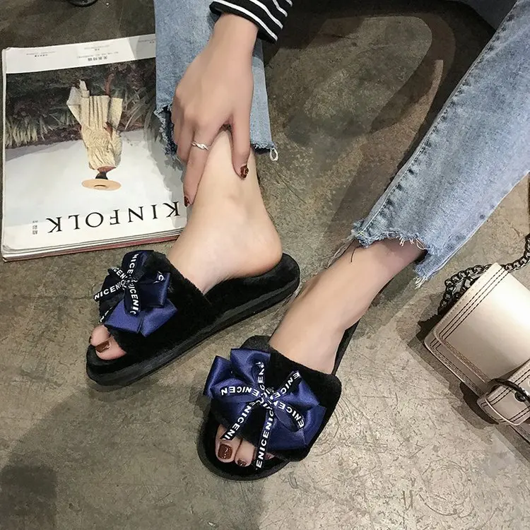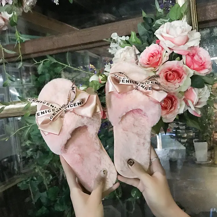 Швабра женская зимняя из хлопка, плюшевые домашние тапочки с искусственным мехом, теплая обувь, без застежки, на плоской подошве, милая обувь с бантом, фотошлепанцы, модель 41