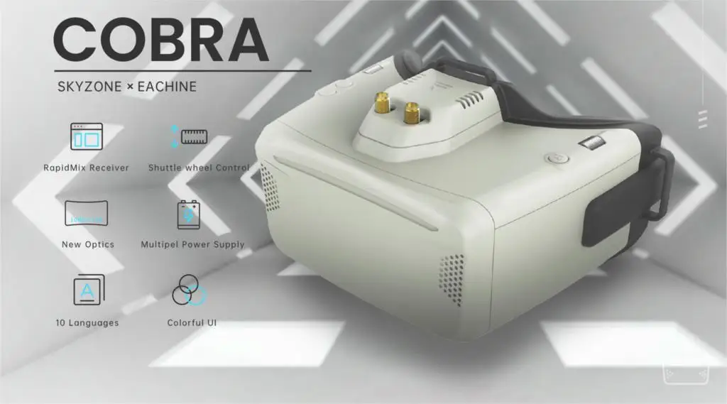 Eachine и SKYZONE Cobra-это очки FPV с ЖК-экраном, экран имеет яркий цвет и высокую яркость, пилот может видеть более подробную информацию в гонках. С приемником RapidMix приемник сливает два сигнала в один, избегайте разрывов изображения и катания, когда сигнал слабый, сделайте изображение более стабильным и четким в сложных условиях. Очки поддерживают летное стекло во время пробежки. Новая ОС с несколькими языками для выбора, пилот не имеет никаких проблем с системой меню, с колесом челнока и новым пользовательским интерфейсом, пилот может установить все настройки, просто прокатив колесо, не снимая очки. Очки могут питаться от 1 аккумулятора 18650 или 2 ~ 6s lipo батареи, зарядка через USB и зарядка постоянного тока делают goggle простым в использовании в рулоне.