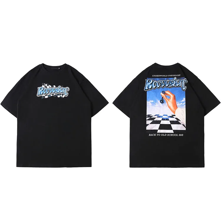 Футболка мужская в стиле хип-хоп, уличная одежда в стиле Харадзюку, футболка с принтом шахматных надписей, свободная хлопковая рубашка с коротким рукавом, большого размера