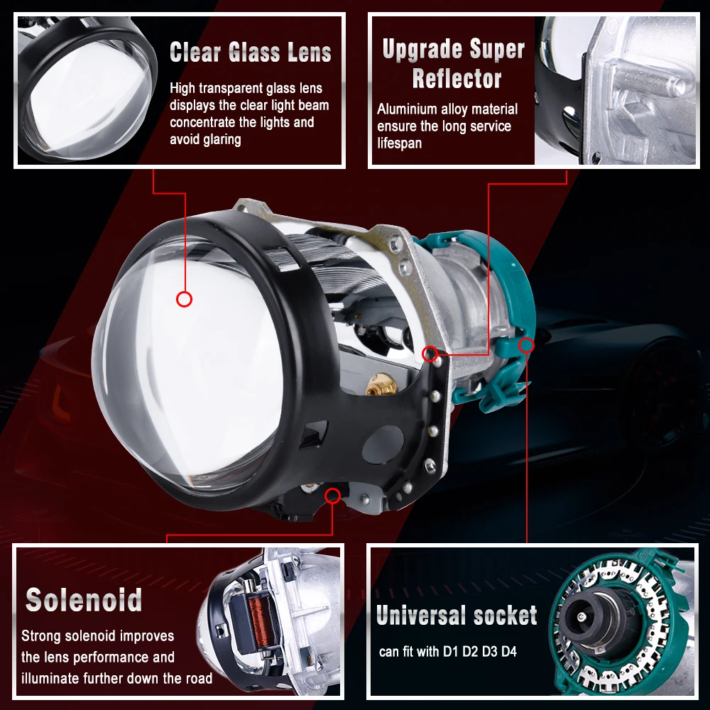 Соленоид: Управляйте щитом вверх или вниз, чтобы переключаться с дальнего света на ближний свет. Больший соленоид в этом объективе гарантирует, что объектив обеспечивает сверхяркий светильник на выходе.