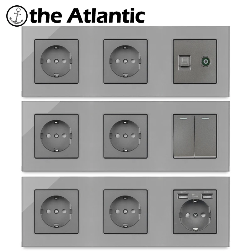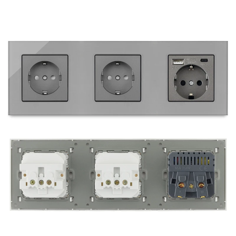 Тройная Розетка с USB-разъемом, настенная розетка с разъемом типа C RJ45, ТВ, антенна RJ11, Спутниковое серое стекло, 16 А, европейская Электророзетка