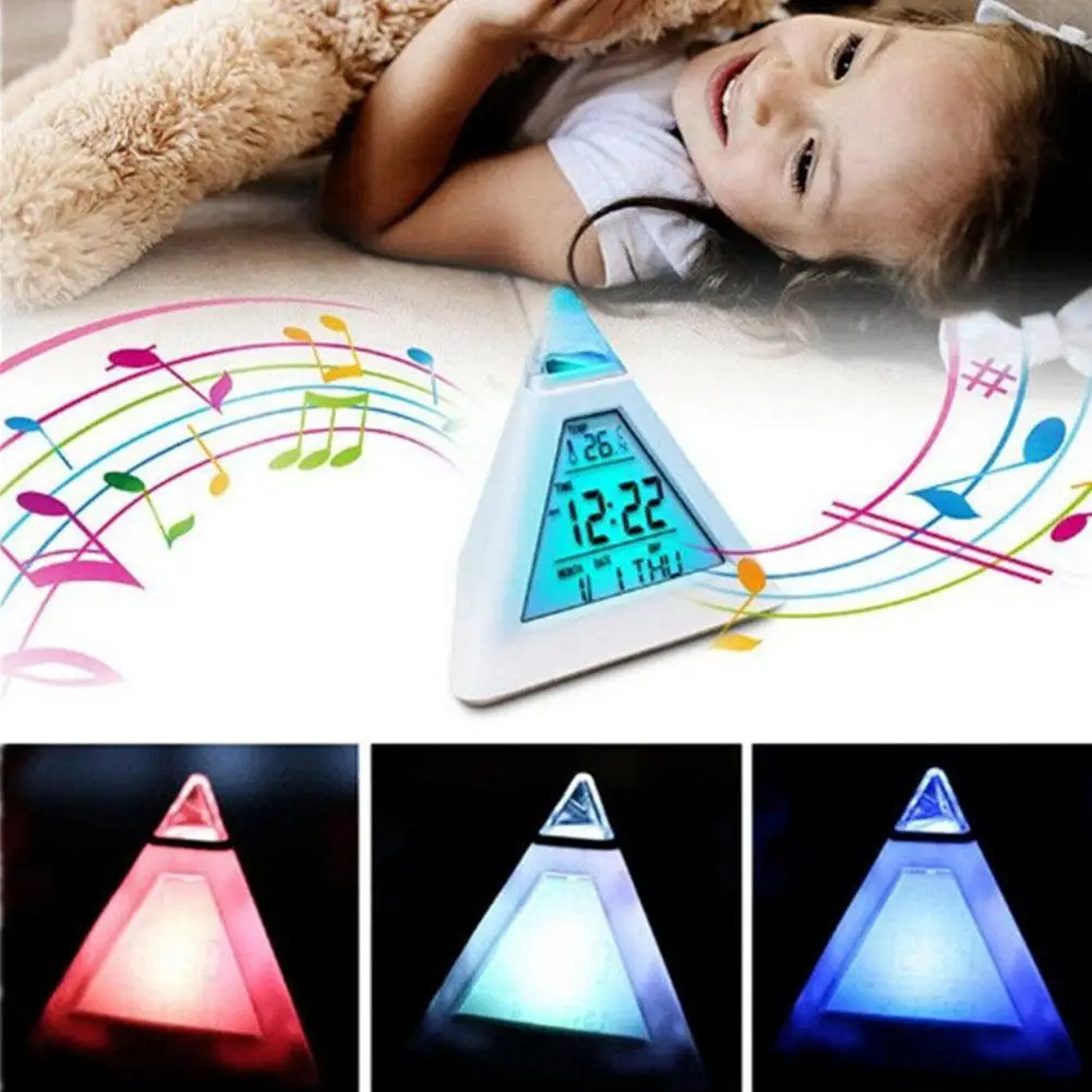 Цветной яркий пирамидный цифровой будильник меняющий цвет календарь термометр украшение для дома