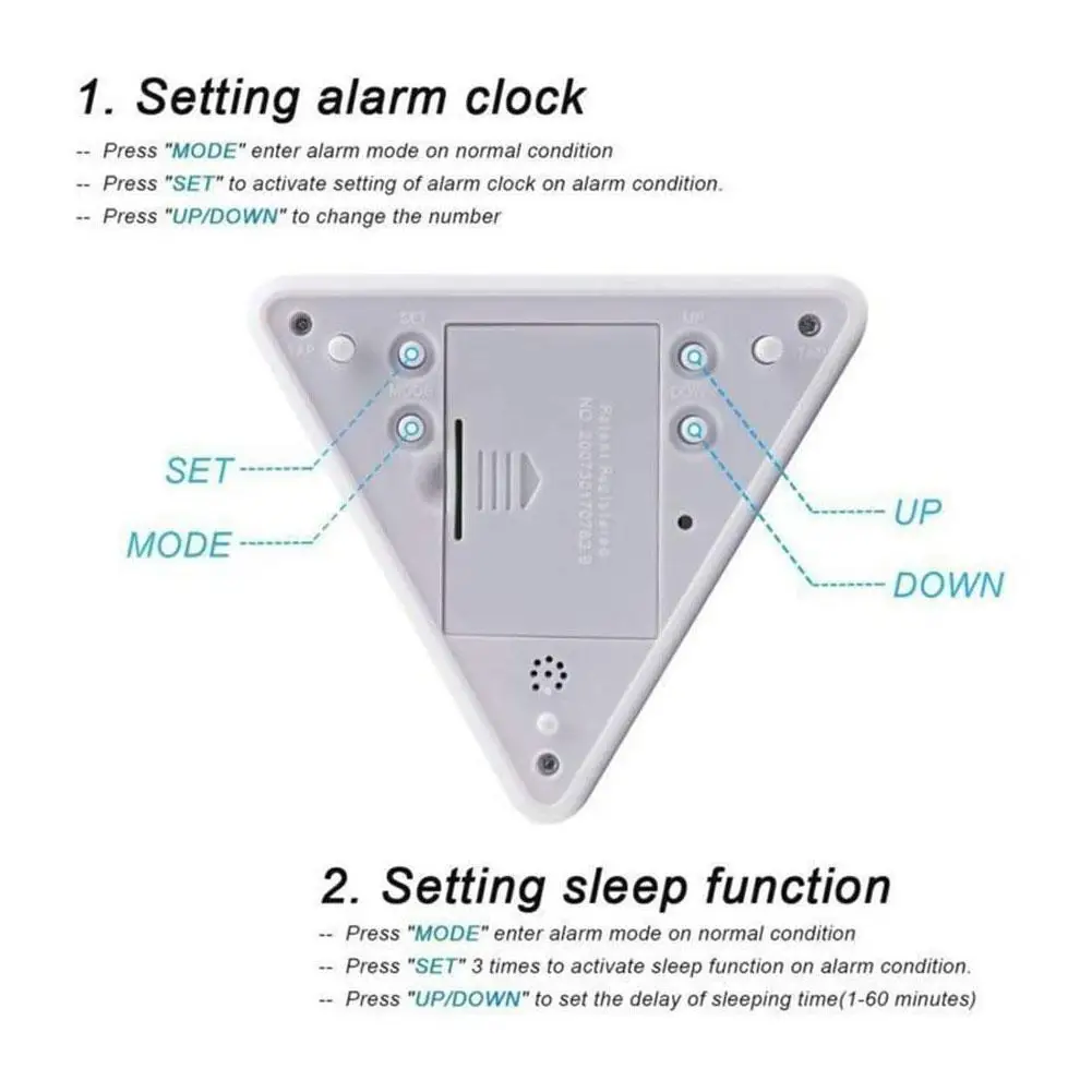 Характеристика:100% новый товар высокого качества.Треугольный 7 светодиодный Будильник с изменением цвета.Его можно разместить в автомобилях, офисах и домах.Эти часы оснащены музыкальным будильником и режимом снаТемпературный режим: автоматически ощущает температуру окружающей среды, этот будильник может реализовать взаимное преобразование между Цельсия и фаренгейтомСветодиодный цвет основной подсветки: красный, зеленый, синий, фиолетовыйЭтот будильник может автоматически включаться в несколько цветовСпецификация:Тип: будильник с пирамидойТип дисплея: номерФорма: треугольникСветильник 7 цветовЦвет изделия: белыйМатериал: АБС-пластикБатарея: 3 * AAA батареи (не входят в комплект)Нормальный режим: отображение времени, даты и температуры, как правилоФункция: эти часы могут быть разноцветными, используйте часы для настройки настроенияПосылка включает в себя:1 x цифровой будильник (не включая батарею)Примечания:Из-за разницы в освещении и настройках экрана цвет изделия может немного отличаться от изображения.В связи с различными ручными измерениями возможны незначительные различия в размерах.
