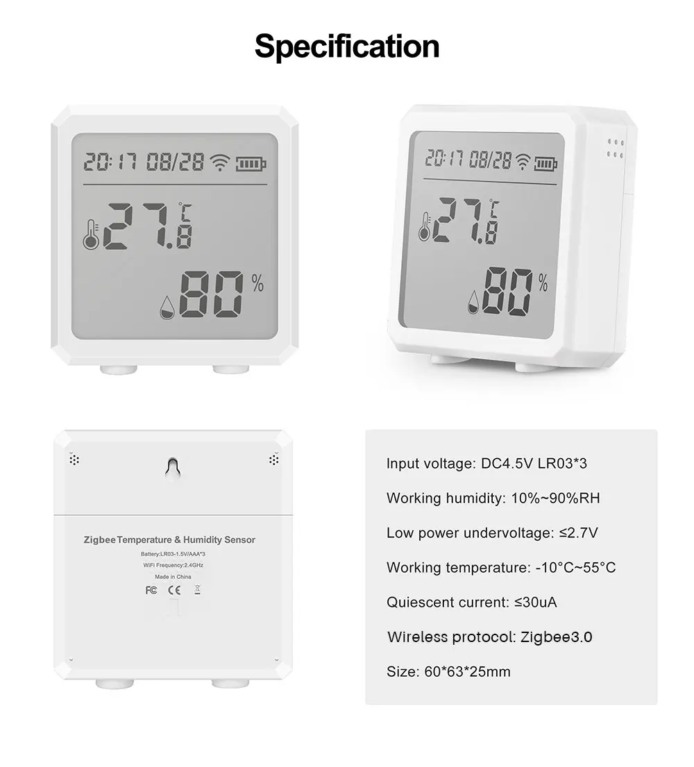 Размер: 60*63*25 ммВходное напряжение: DC4.5V LR03 * 3 (не входит в посылка)Ток покоя: ≤ 30uAНизкая мощность напряжения: ≤ 2,7 VБеспроводной протокол: Zigbee3.0Рабочая температура: -10 ℃ ~ 55 ℃Рабочая влажность: 10% ~ 90% относительной влажности
