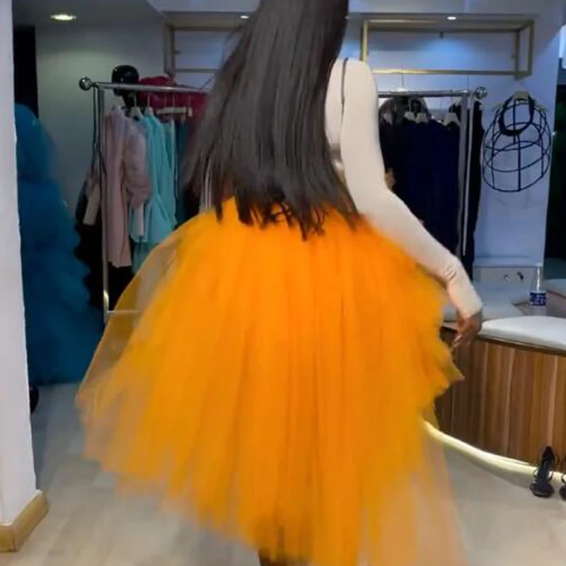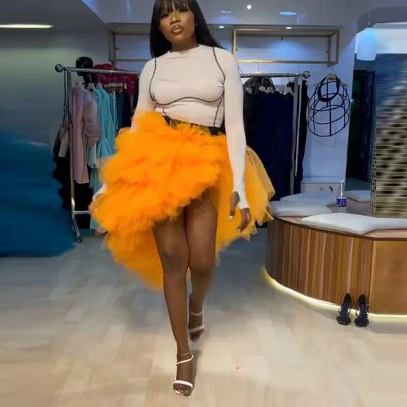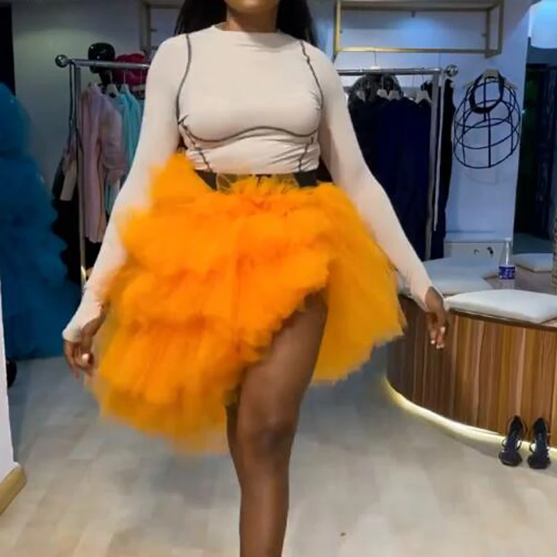 Оранжевая юбка до середины тела, фатиновая юбка с оборками в несколько рядов для черных девушек, индивидуальное изготовление, асимметричные вечерние платья с высоким и низким вырезом