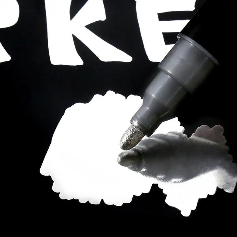 На светлом фоне разница с обычным серебристым маркером не заметна, а вот на темном разница очевидна. Очень хороший маркер.