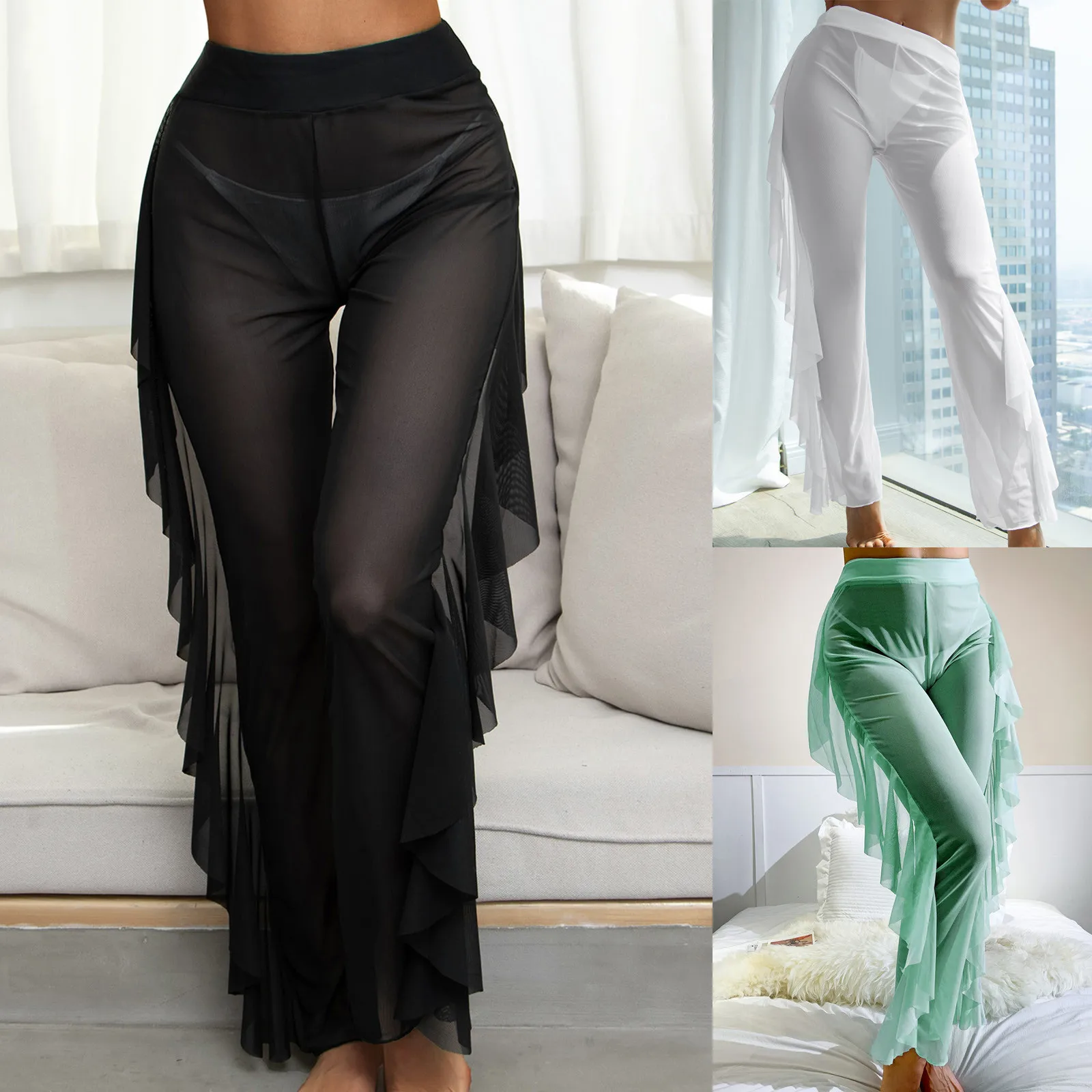 Женские пикантные прозрачные брюки из тюля с высокой талией, широкие однотонные брюки, пляжные Длинные свободные брюки черного, белого, абрикосового цветов