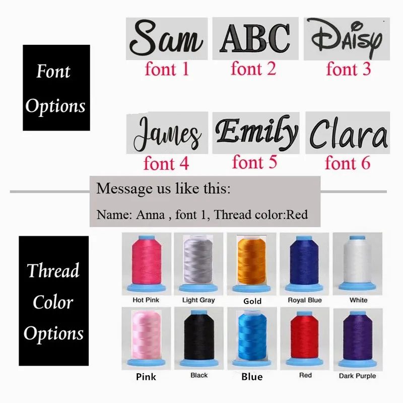 Если вы разместили заказ на обычное имя. Пожалуйста, выберите тип шрифта и цвет резьбы, который вам нужен: