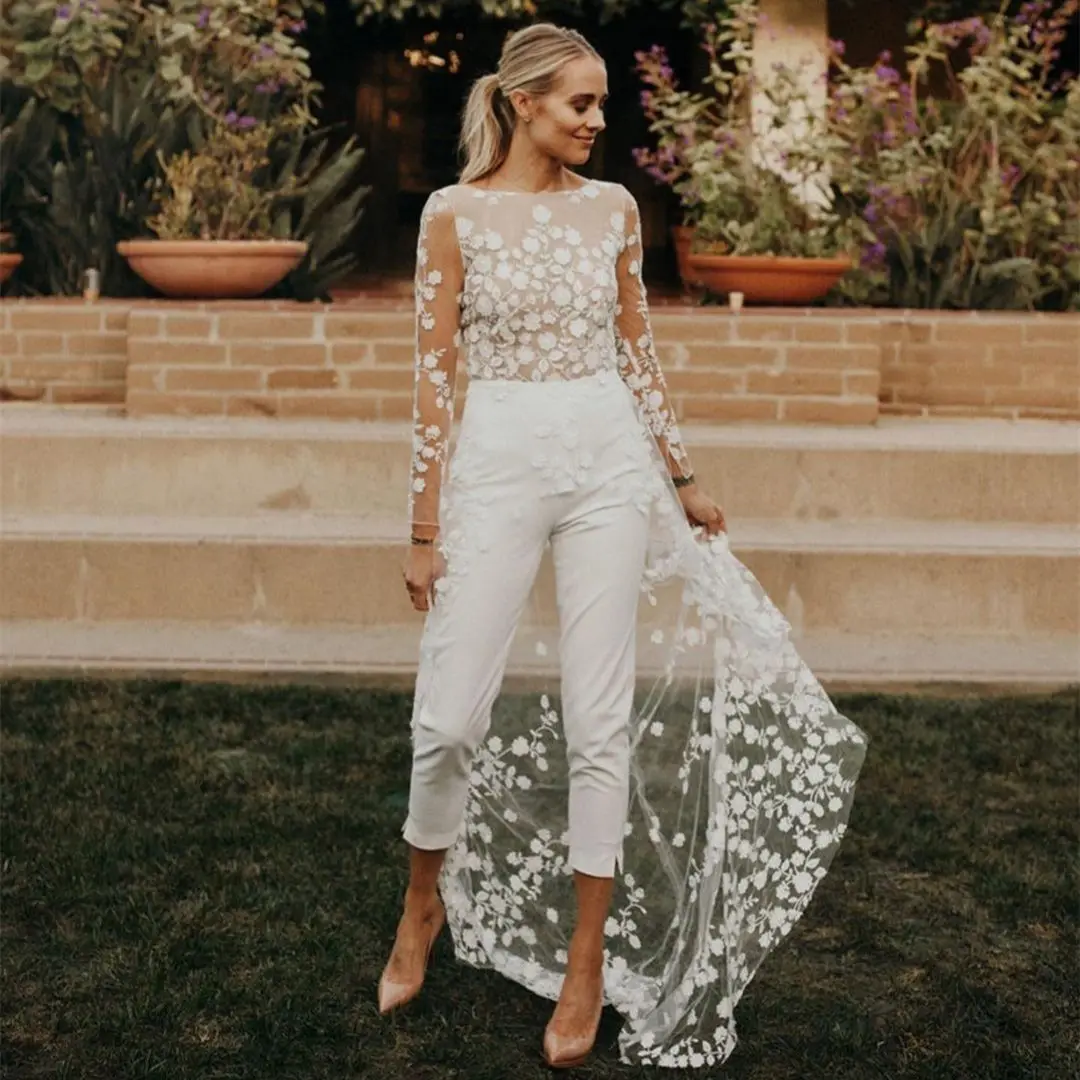 Женский кружевной комбинезон со шлейфом, с открытой спиной и длинными рукавами