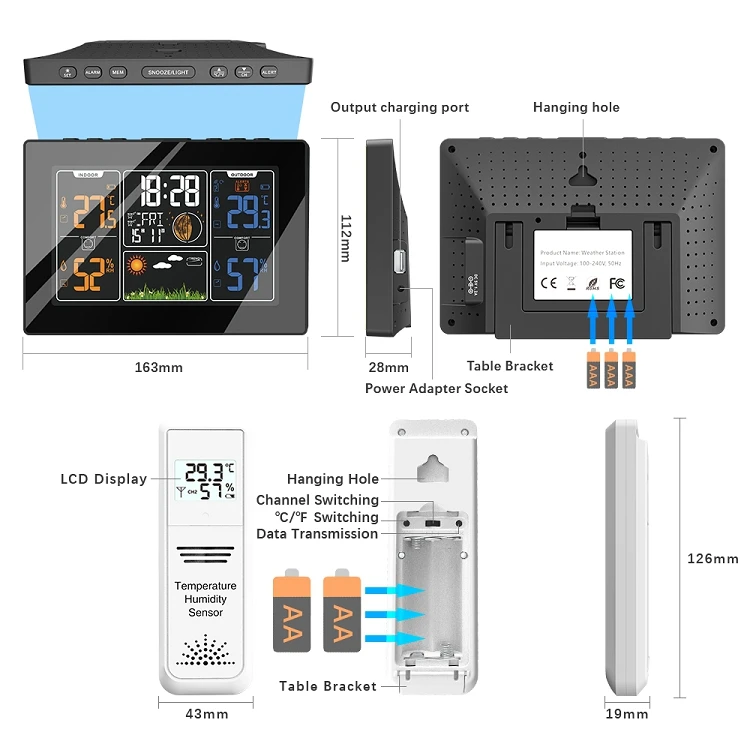 Календарь.Optional дополнительный режим отображения времени: 12 часов/24 часа.Personalized индивидуальный режим сигнализации: сигналы тревоги могут устанавливаться отдельно в будние и выходные дни.Snoбудильник повтора: интервал можно регулировать▲ Фаза Луны.Temperature температура и влажность, тренд температуры и влажности.Trend тренд атмосферного давления. Диапазон измерения давления: 600 hPa/mb ~ 1100 hPa/mb.Humidity Влажность: внутренний и наружный Датчик Диапазон измерения: 10% RH ~ 99% RH.▲ Температура (℃ или ℉ можно переключать).Внутренний хост метеостанции:Диапазон измерения температуры: 0 ℃ ~ 60 ℃ (32 ℉ ~ 140 ℉), разрешение измерения температуры: 0,1 ℃ (32,18 ℃).Открытый Дистанционный датчик:Диапазон измерения температуры:-40 ℃ ~ 60 ℃ (- 40 ℉ ~ 140 ℉).Температура Дискретность: 0,1 ℃ (32,18 ℉); Влажность в помещении и на открытом воздухе Диапазон измерения: 10%-99% относительной влажности.Разрешение измерения влажности: 1%.